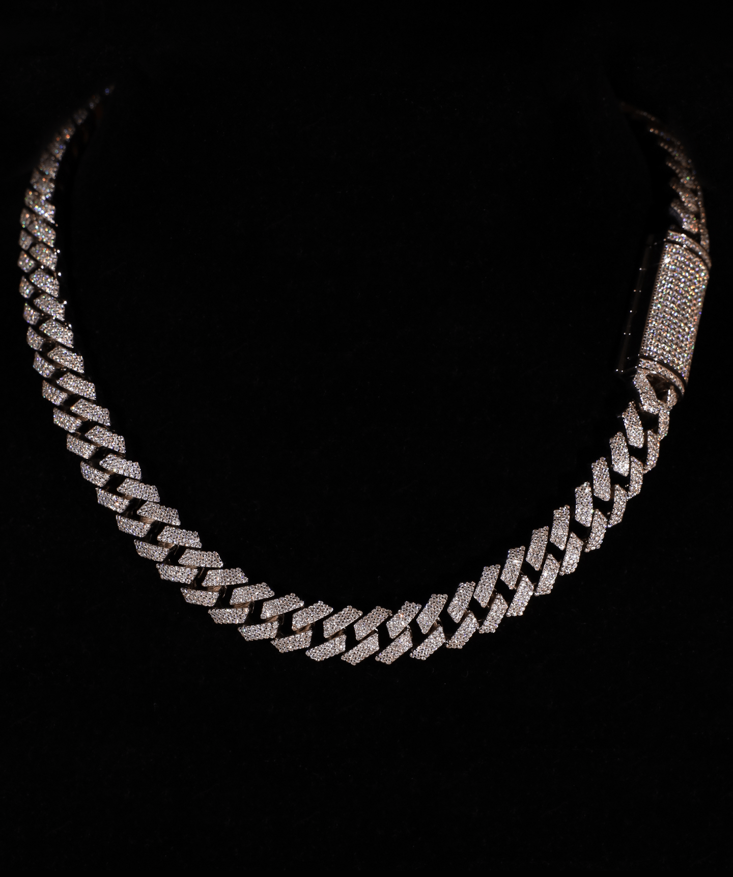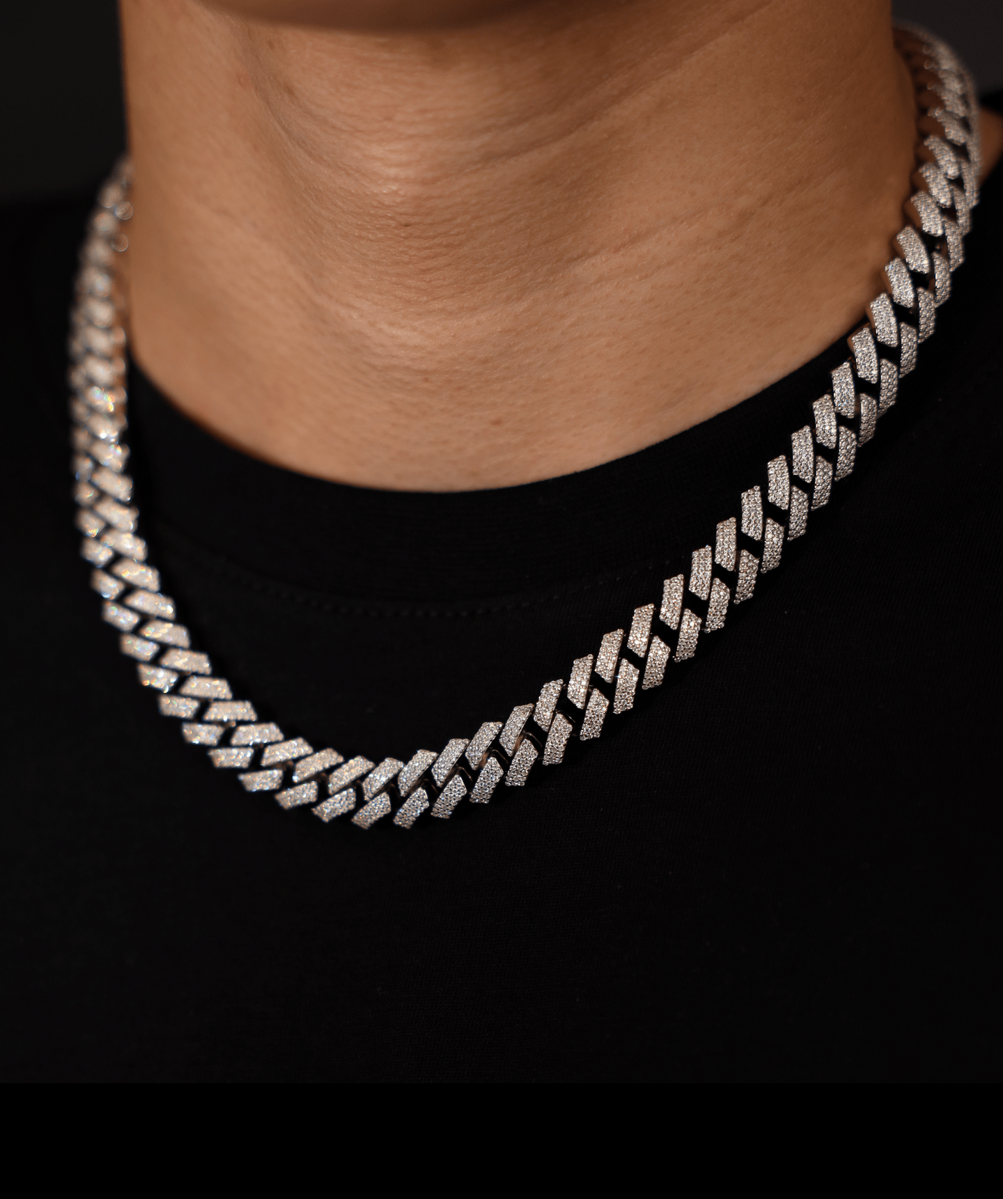 The 12mm prong Cuban link chain is a statement of precision and craftsmanship. Every stone is prong set, allowing for maximum light reflection and depth. The 925 silver base, finished in rhodium, enhances durability and sheen, ensuring a lasting presence. The links are structured for a solid, weighted feel, with a box clasp detailed in pavé-set stones for a seamless yet functional closure. A signature piece, designed for those who recognise impact in the details.