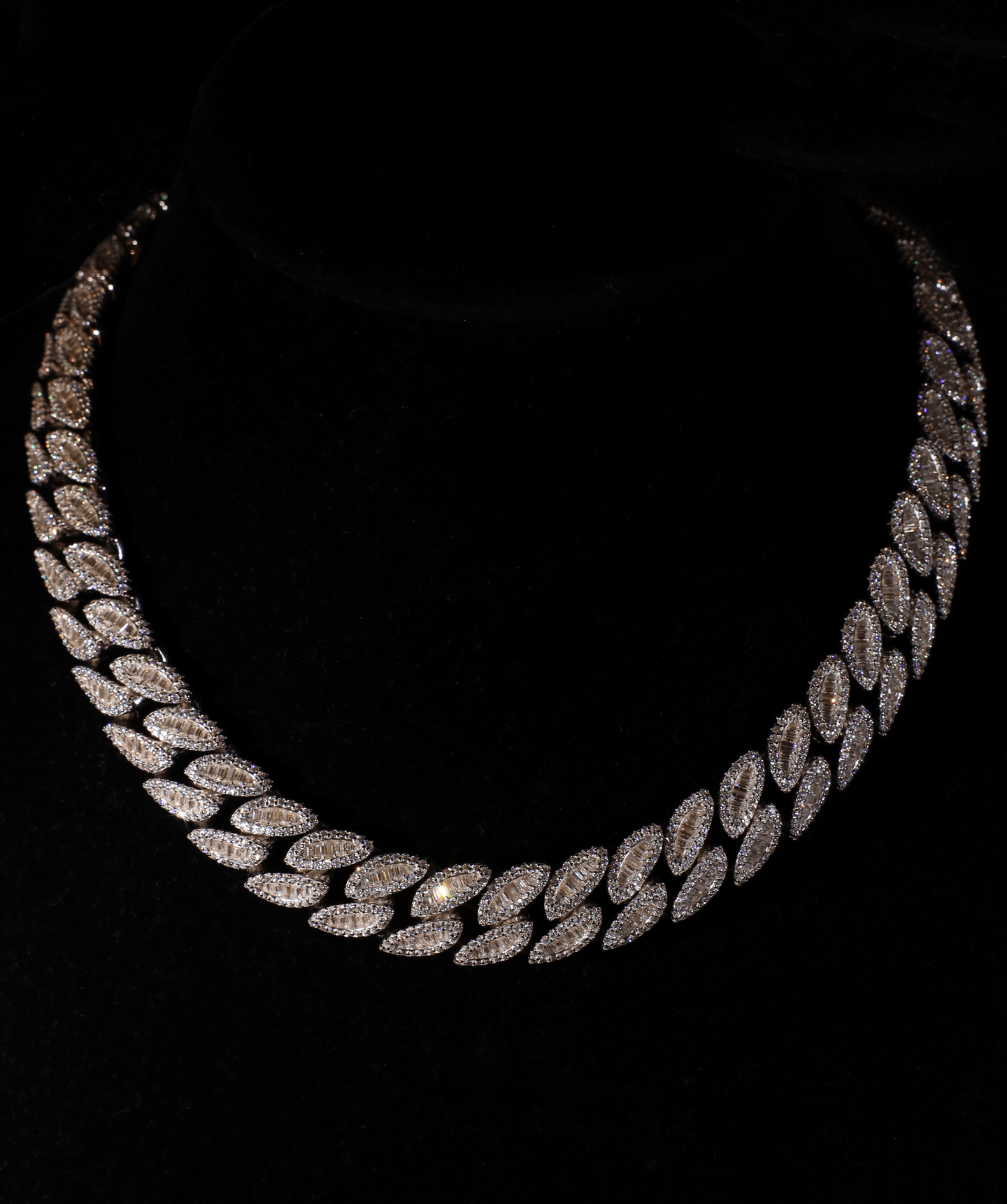 Each link is crafted with precision, featuring an elongated oval silhouette adorned with an array of meticulously set pavé stones. Baguette-cut stones accentuate the centre, adding dimension and depth to the composition. The curvature of the links ensures a seamless flow, allowing the chain to sit with effortless dominance around the neck. Its substantial 16mm width strikes the perfect balance between boldness and sophistication, making it an essential statement piece.