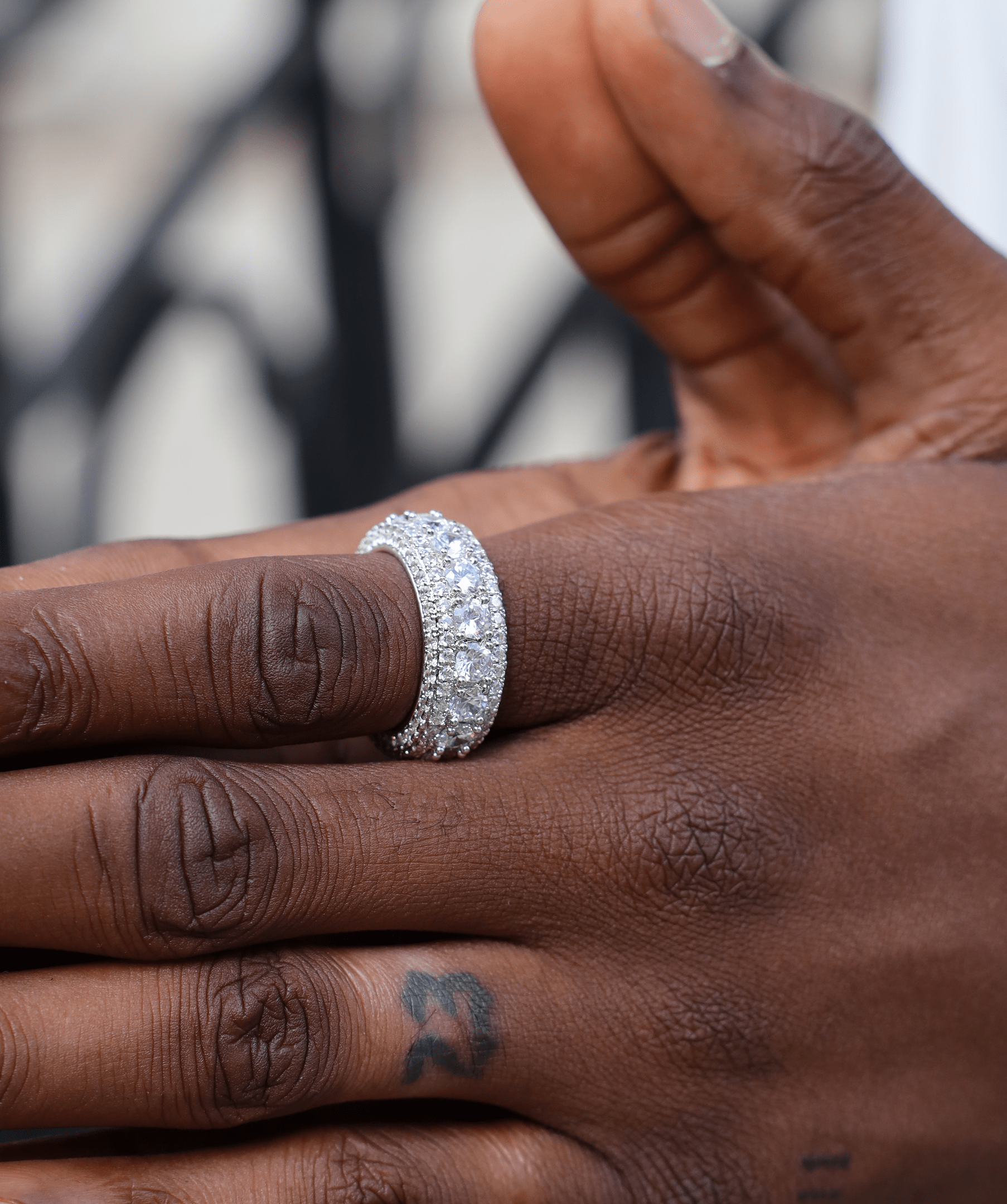 A statement of brilliance and boldness, the 5-row band ring delivers an unmatched shine with its layered, fully iced design. Whether worn alone or stacked, it exudes a commanding presence with every movement.