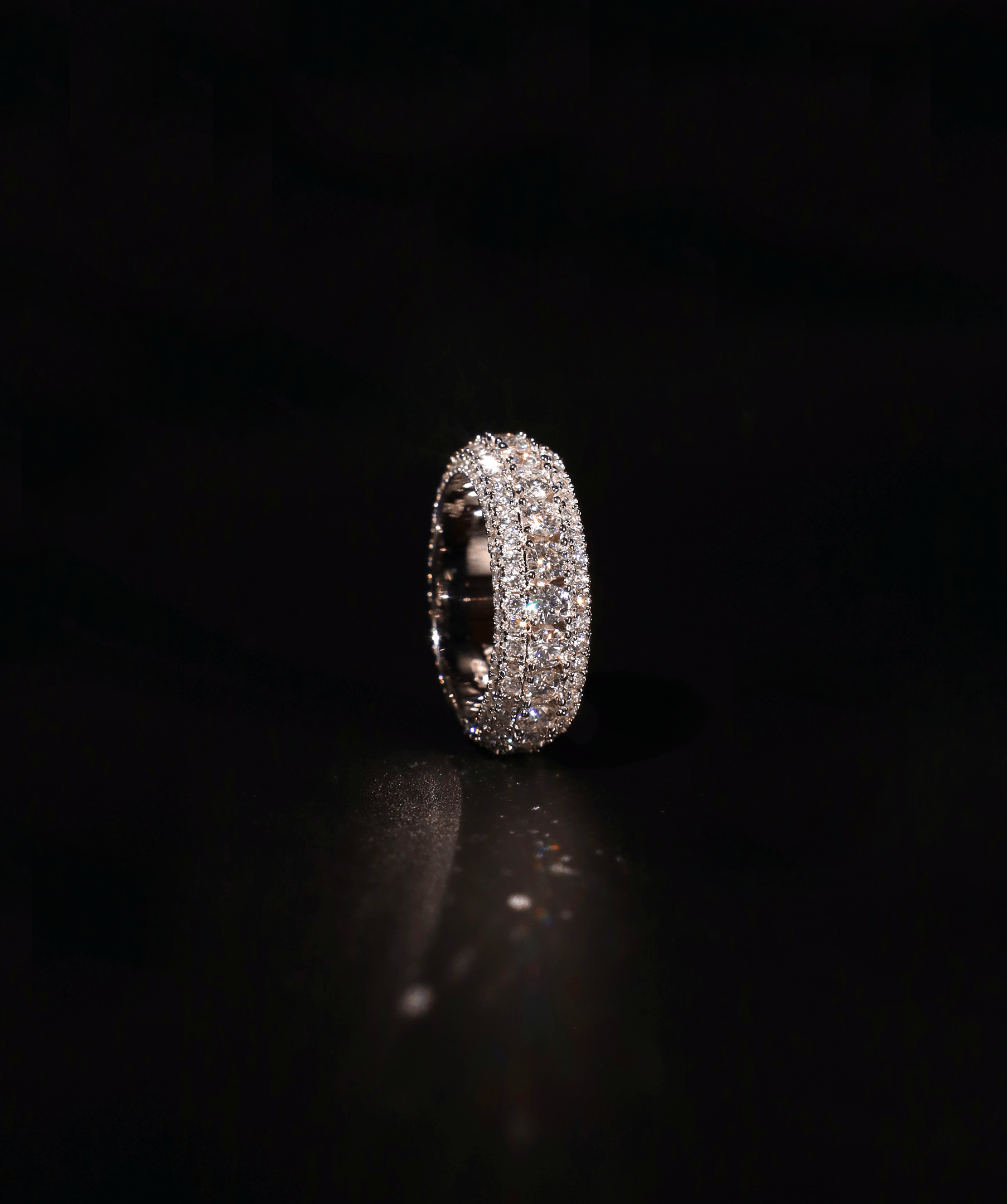 The 5-Row Band Ring is engineered for those who seek presence and power in their jewellery. Featuring a dynamic blend of pavé and prong-set stones, its multi-dimensional structure catches and reflects light from every angle. The central row of bold round-cut stones is framed by intricate pavé detailing, enhancing depth and intensity. With a 9.4mm width and a robust yet comfortable fit, this piece asserts itself effortlessly. Inside, the ICED LONDON engraving signifies authenticity, marking it as a creation of uncompromising quality. A ring not just to wear but to own—a symbol of status, ambition, and distinction.
