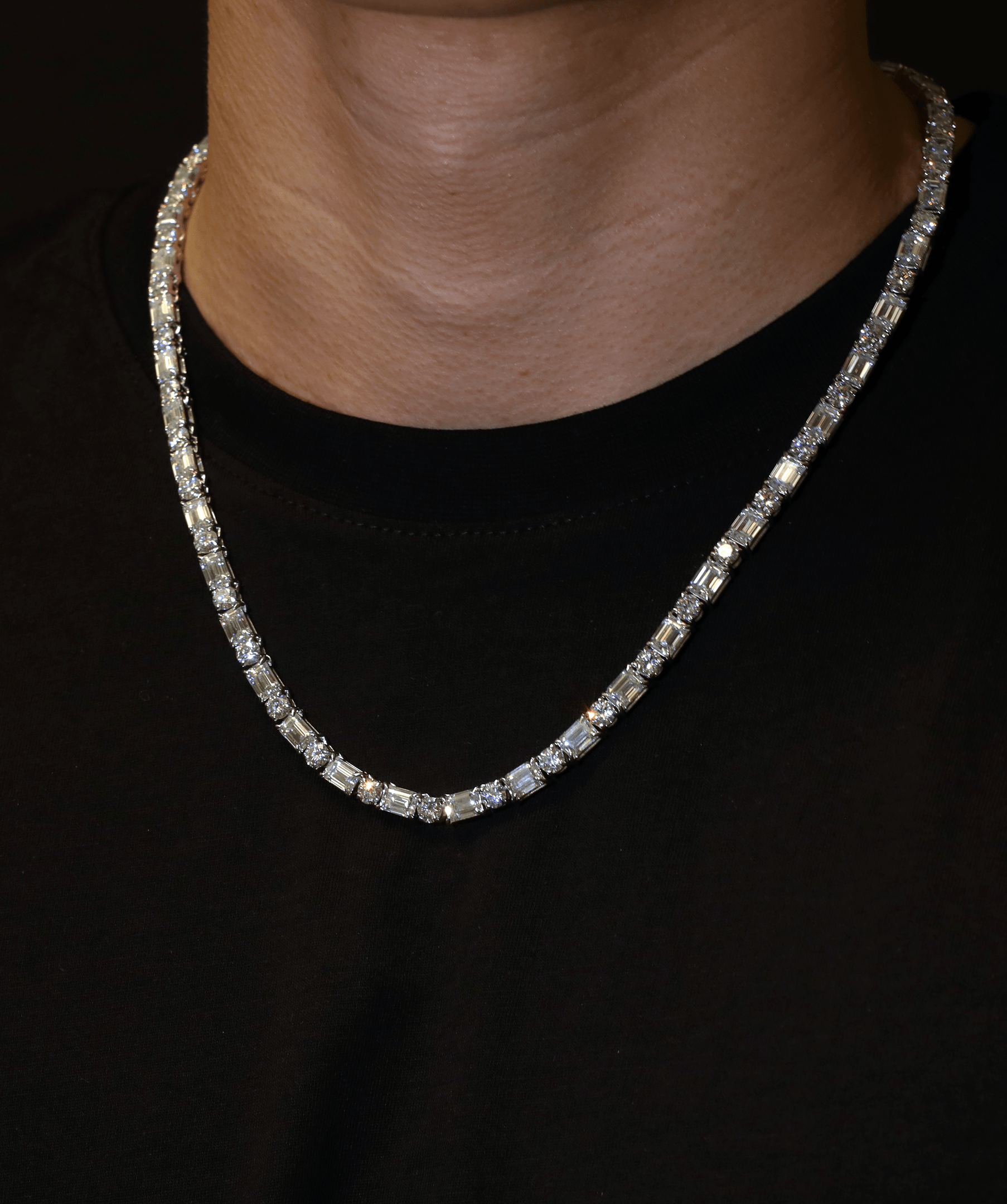 The 5mm Round & Emerald Tennis Necklace is a masterful fusion of classic and contemporary design, seamlessly blending the brilliance of round-cut stones with the refined elegance of emerald-cut stones. A sophisticated statement piece that embodies pure luxury.
