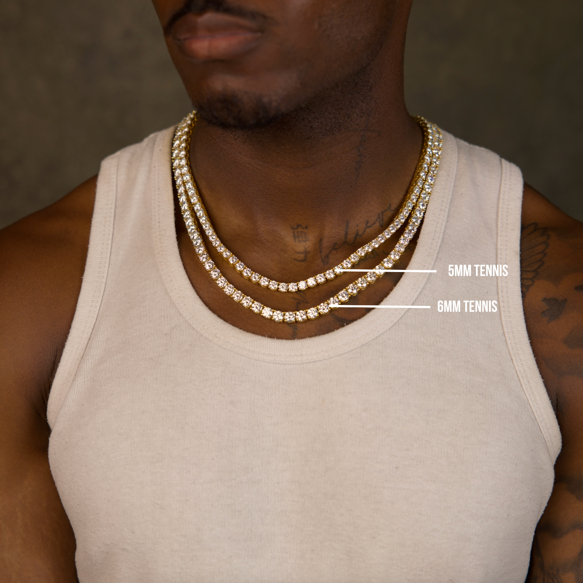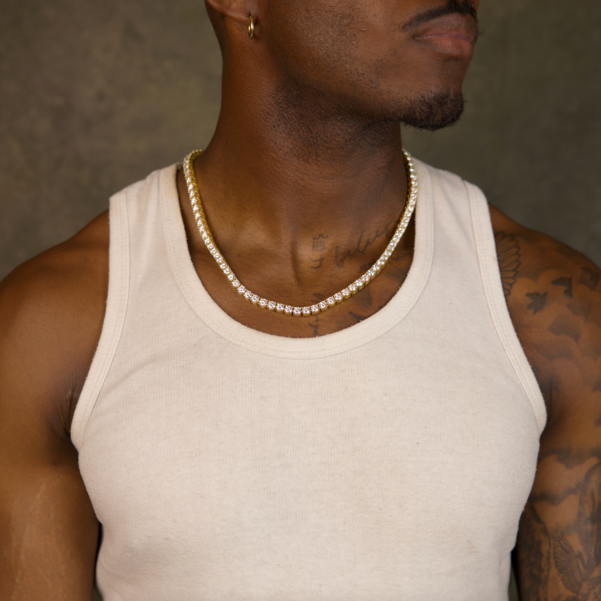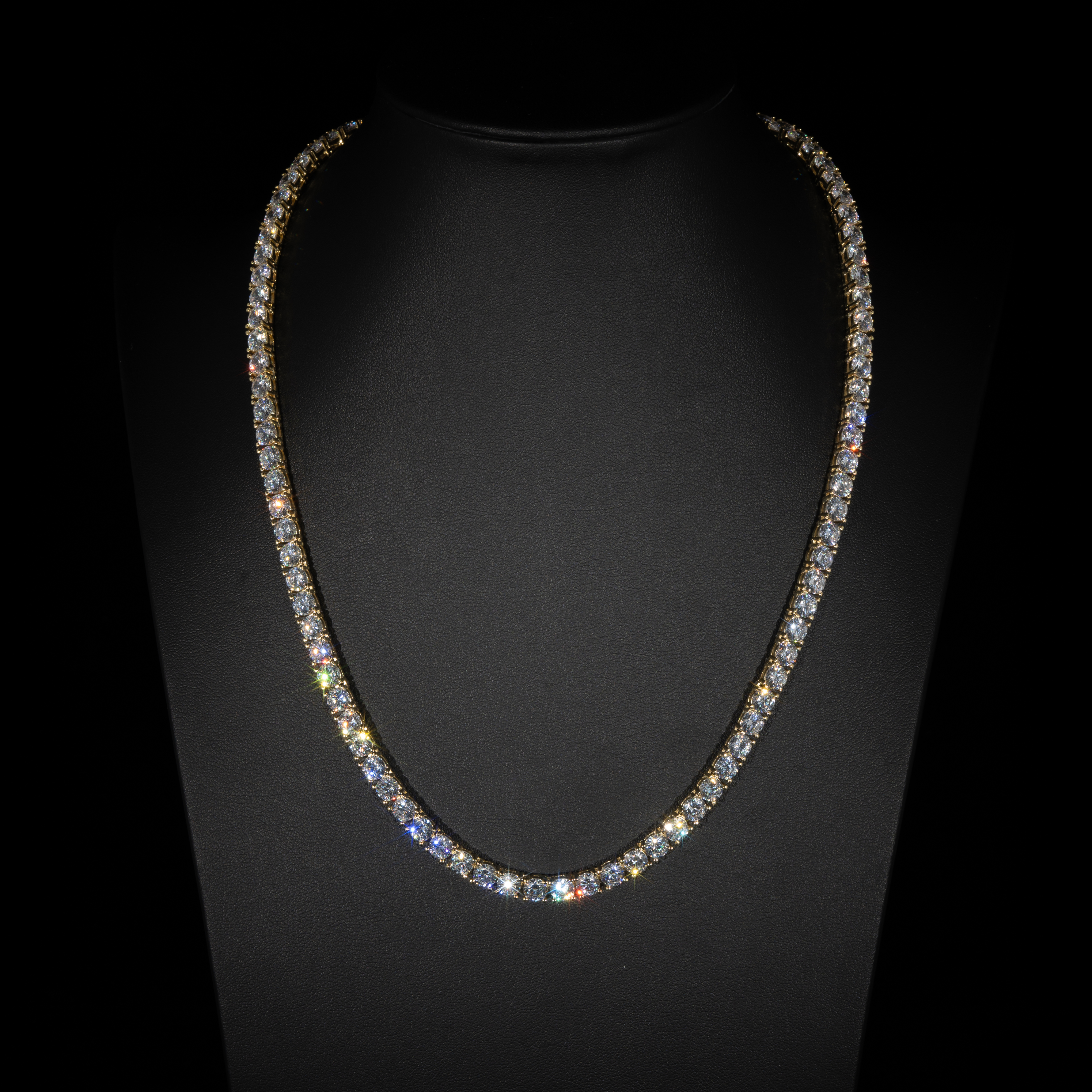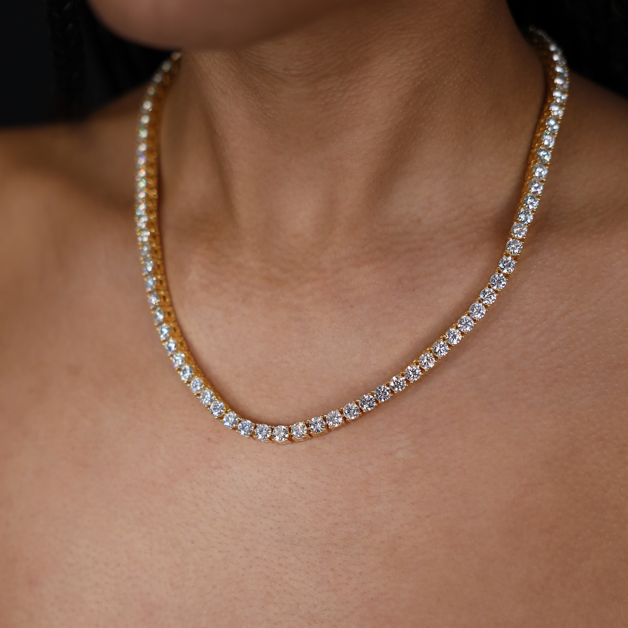 A staple of status and style, the 5mm Tennis Necklace delivers unrelenting shine with its perfectly aligned round-cut stones. Each link is precision-set to create a seamless flow of light, ensuring maximum radiance at every angle. Designed for those who appreciate both craftsmanship and presence, this piece offers a balance of weight and comfort, allowing it to sit effortlessly on the neck. The secure clasp ensures durability, making it a statement that lasts beyond the moment.