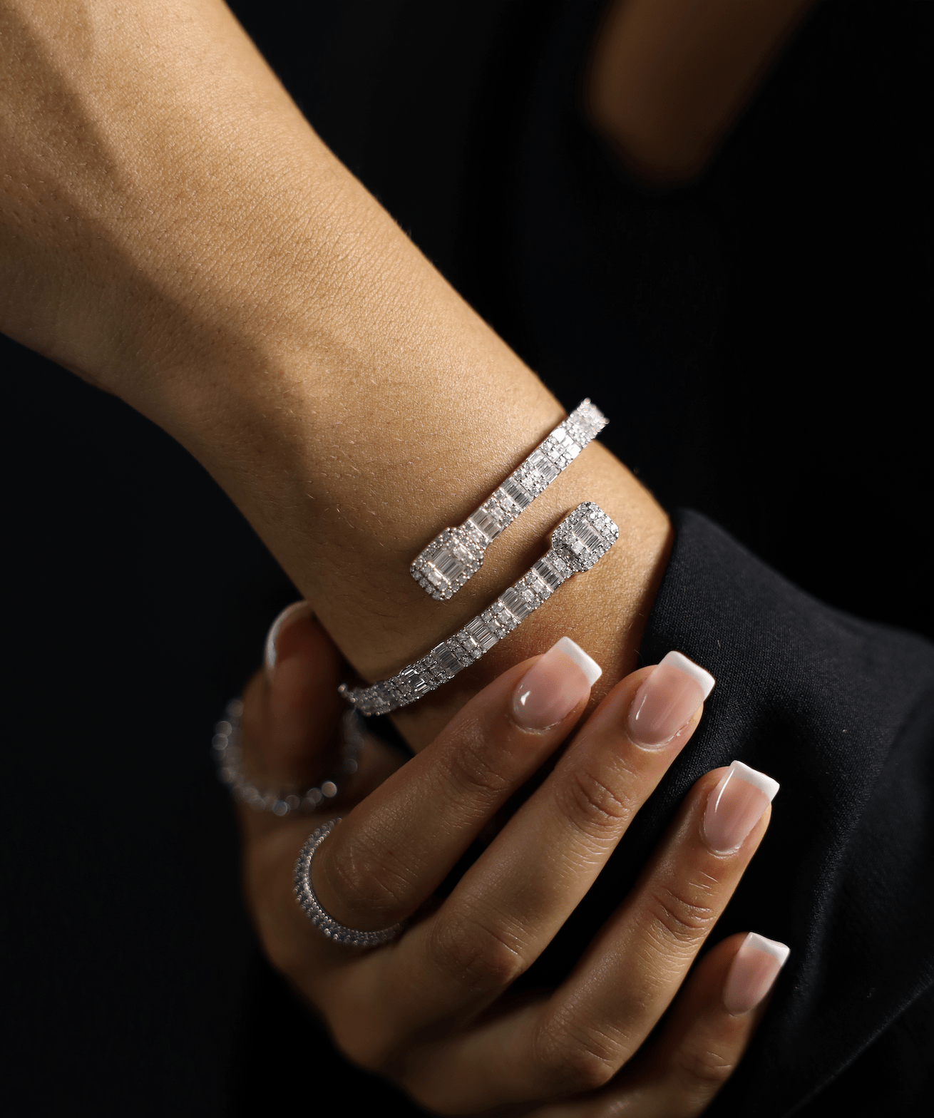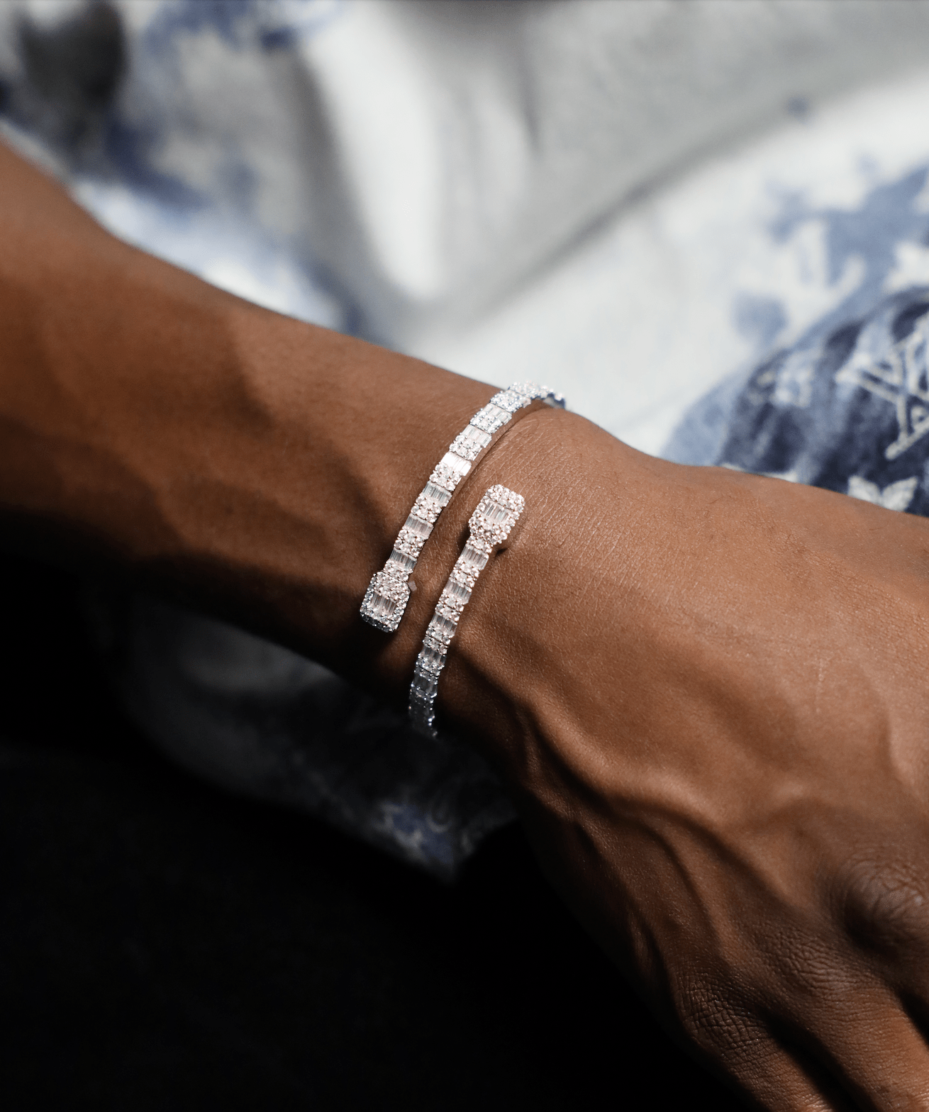 The 5mm Baguette Bangle is a seamless fusion of strength and precision, crafted from 925 sterling silver with rhodium plating and defined by its striking arrangement of baguette-cut stones. The clean, geometric profile creates a bold yet refined presence on the wrist, catching the light from every angle. Designed with an open-ended fit for ease of wear, this bangle delivers effortless luxury with a modern edge. Whether worn solo or stacked, it speaks to those who appreciate craftsmanship and understated power.
