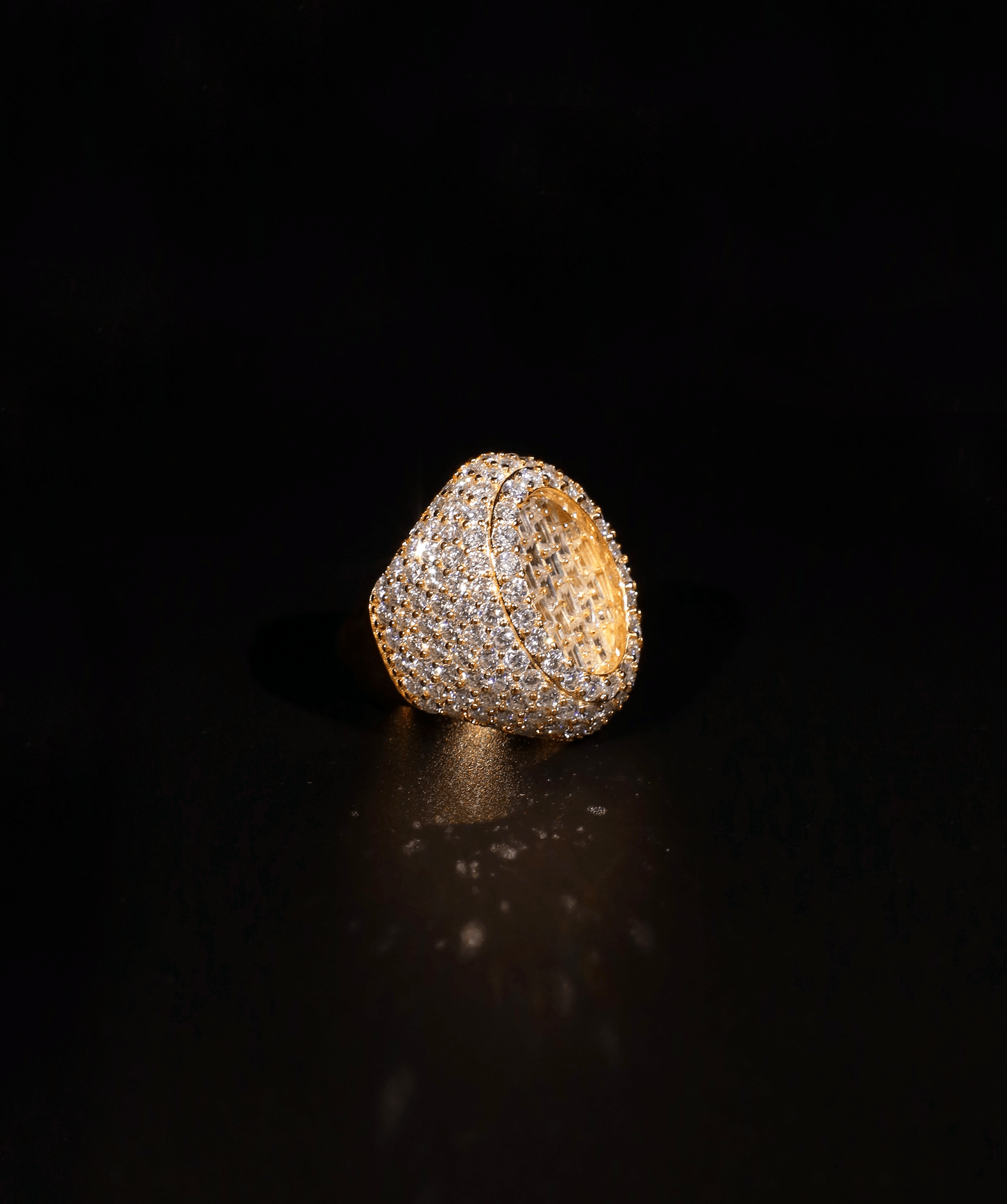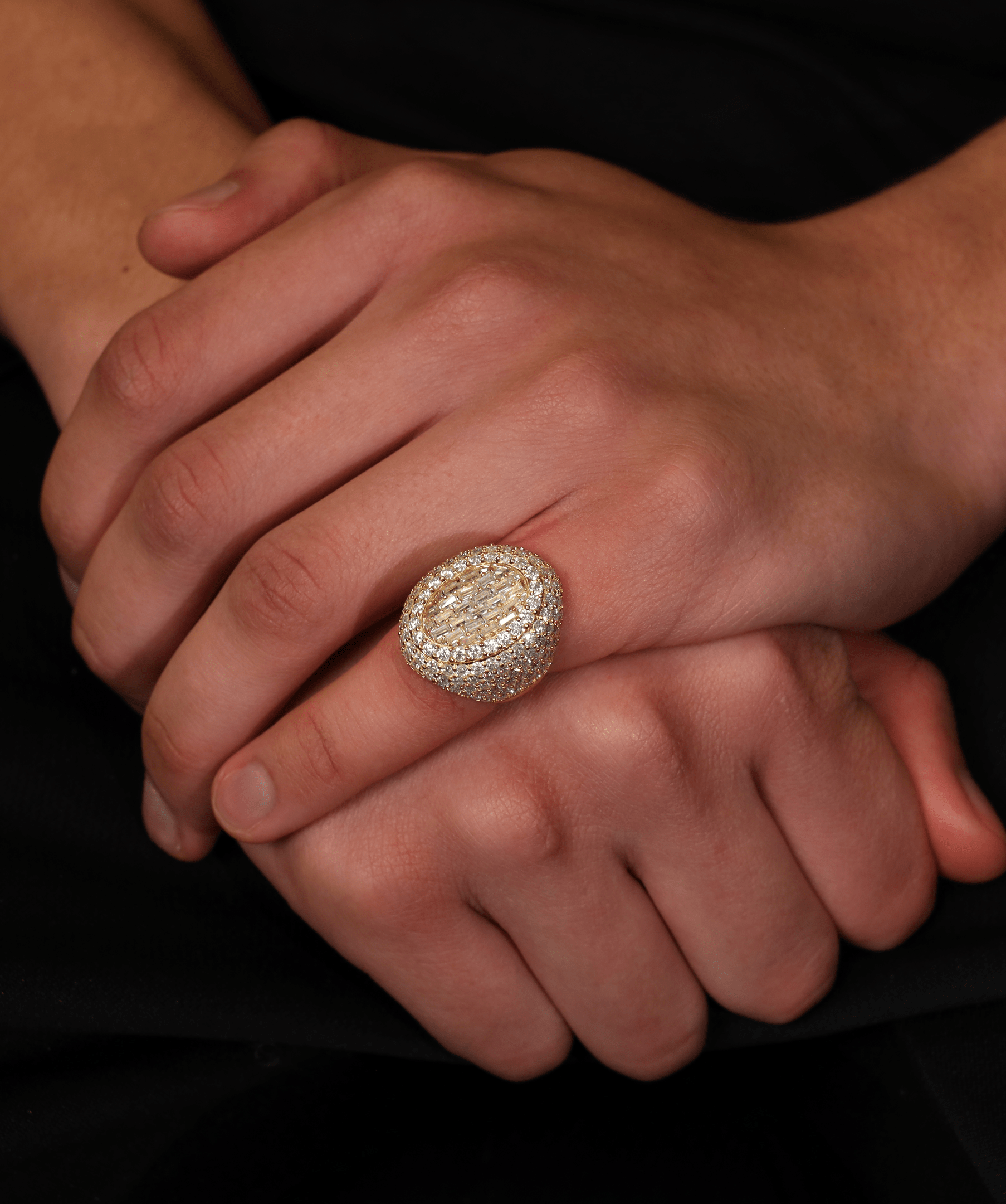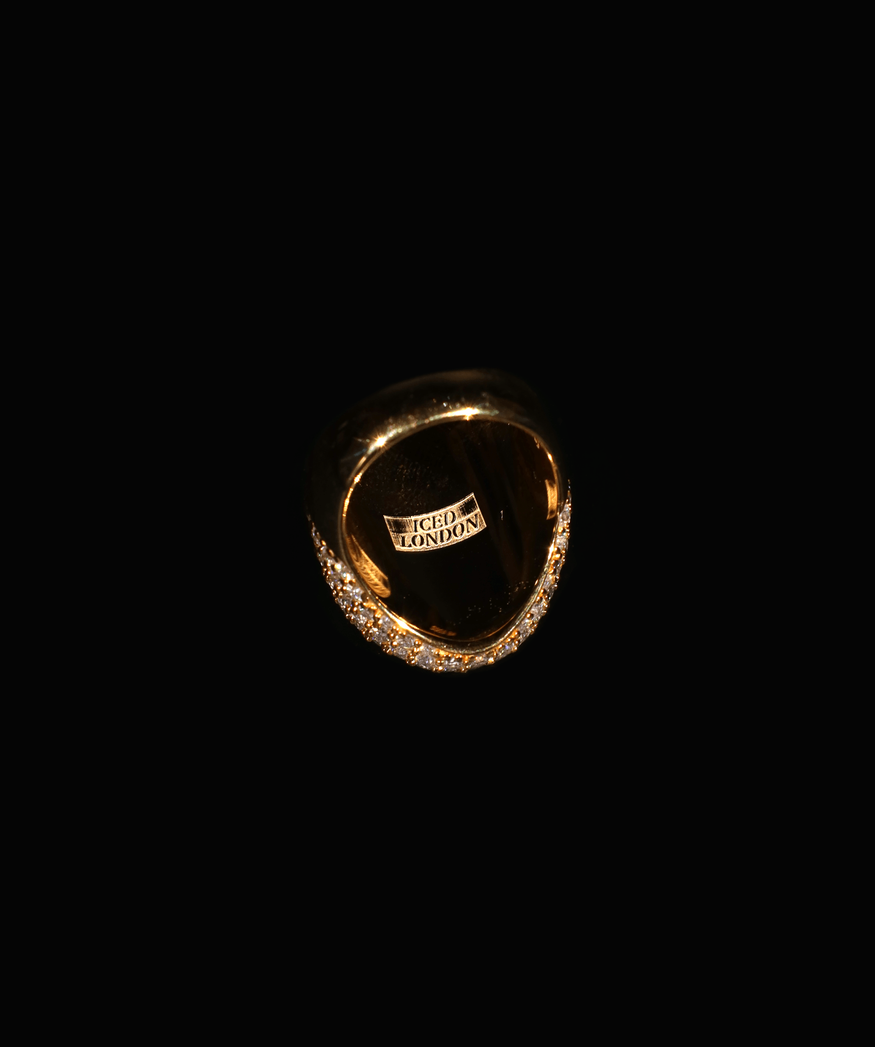 The grand oval centrepiece is surrounded by a meticulously paved surface, ensuring brilliance from every angle. Each stone is carefully set to create an unbroken field of shine, forming a seamless blend of symmetry and radiance. With its structured build and substantial weight, this ring commands attention without compromise. The inner band is engraved with ICED LONDON, a mark of prestige and craftsmanship. Whether worn as a personal emblem of status or a statement of refined power, this piece delivers unparalleled impact.