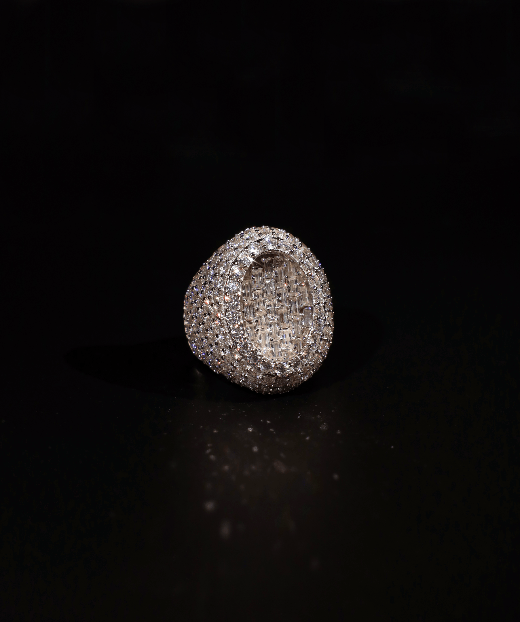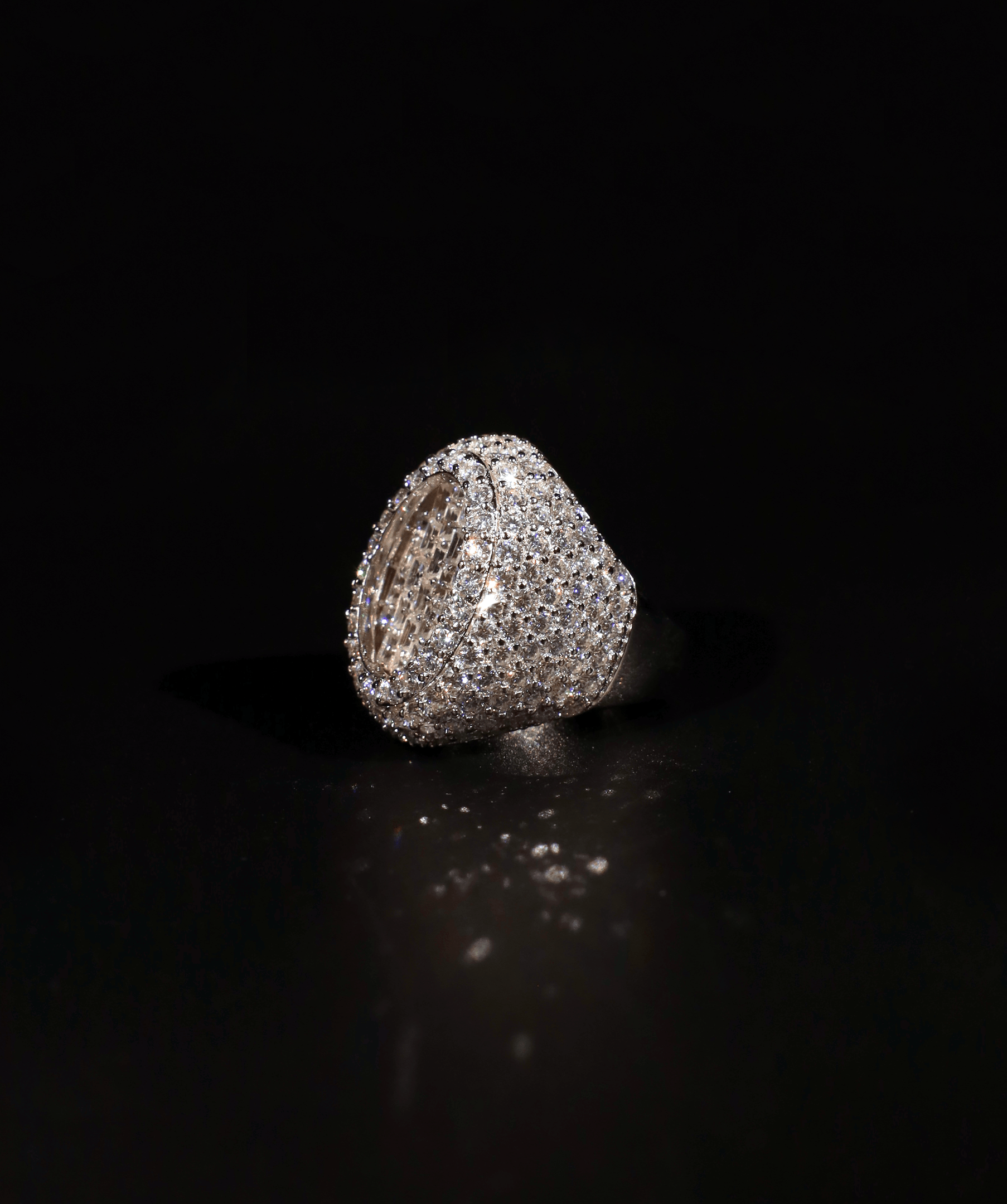 - Fully iced pavé setting covering the entire ring