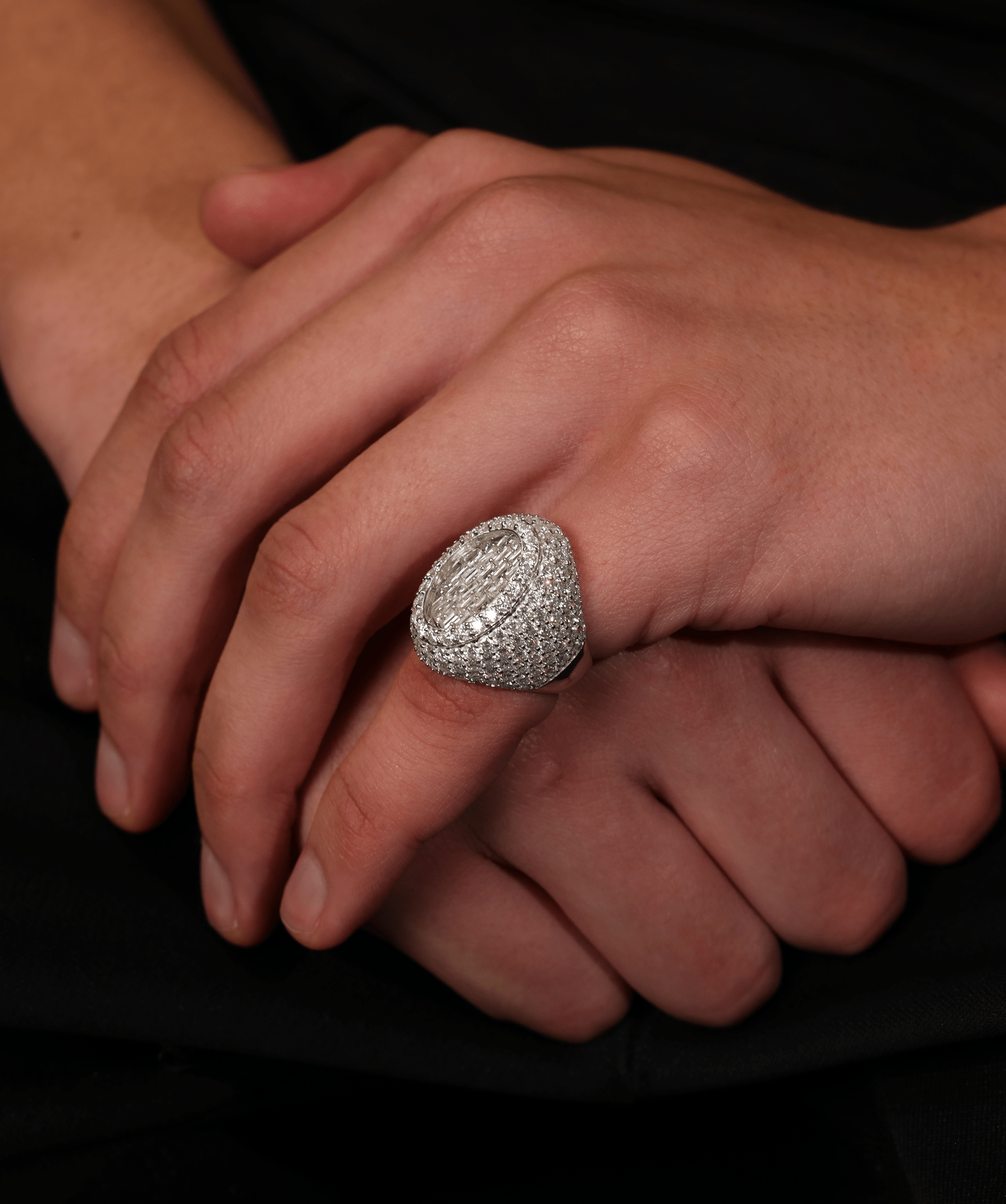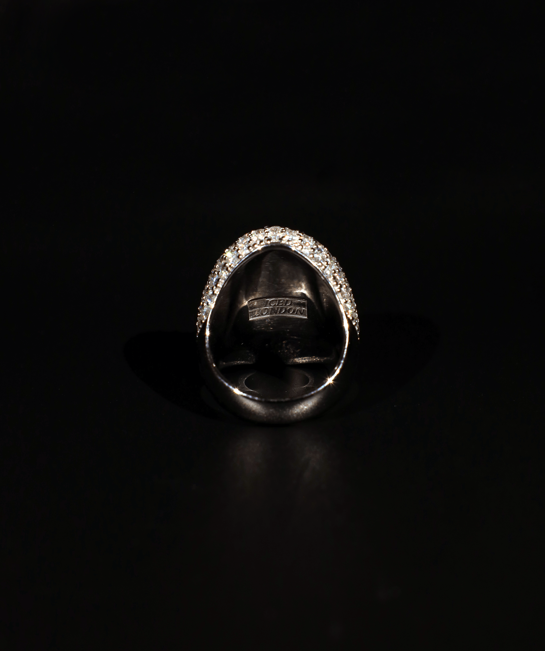 The grand oval centrepiece is surrounded by a meticulously paved surface, ensuring brilliance from every angle. Each stone is carefully set to create an unbroken field of shine, forming a seamless blend of symmetry and radiance. With its structured build and substantial weight, this ring commands attention without compromise. The inner band is engraved with ICED LONDON, a mark of prestige and craftsmanship. Whether worn as a personal emblem of status or a statement of refined power, this piece delivers unparalleled impact.