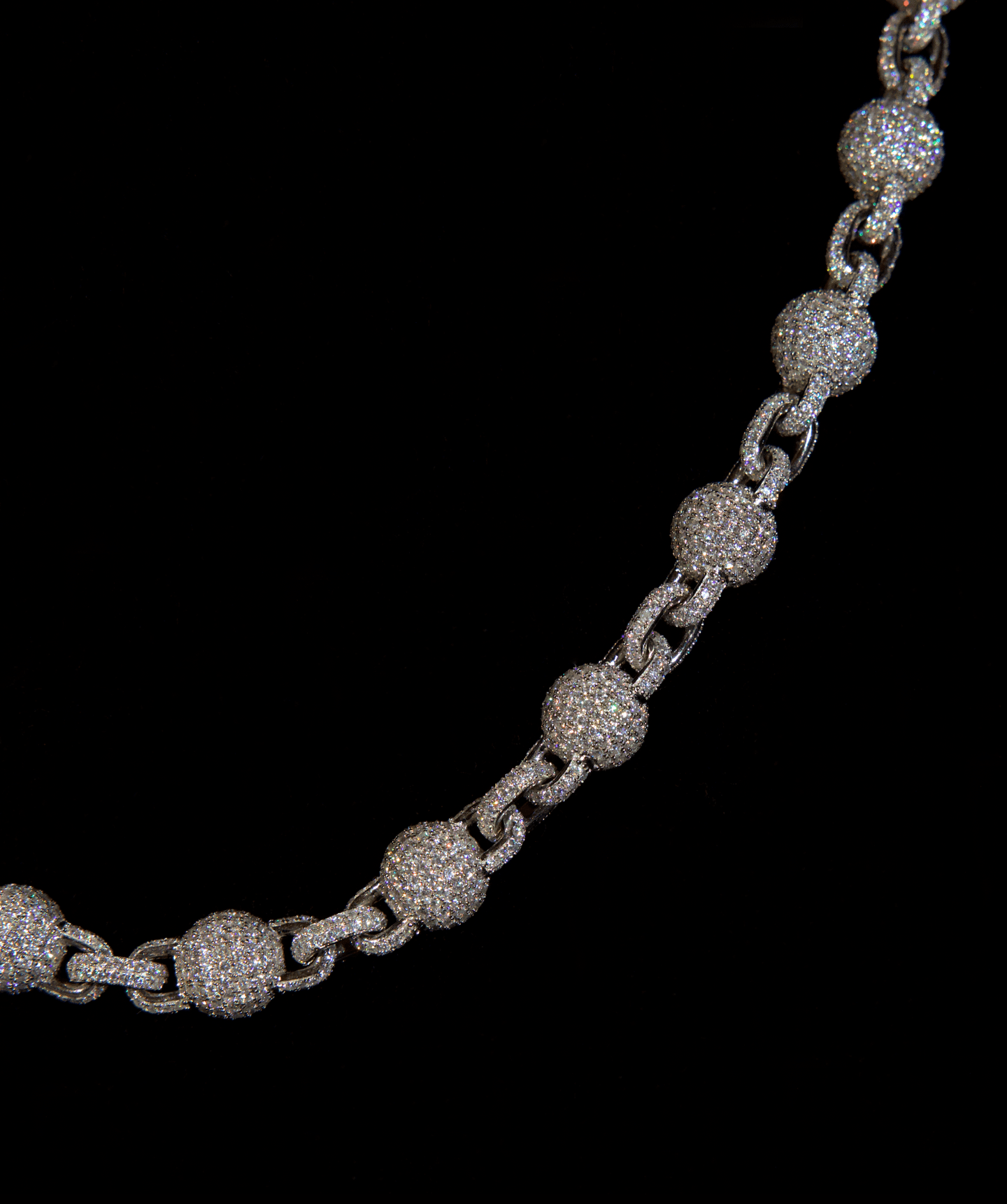 A piece that leaves nothing untouched. Every ball, every link, fully flooded to create an unbroken flow of light. A step beyond traditional chains, this design blends structure with brilliance, delivering a look that is both distinctive and commanding.