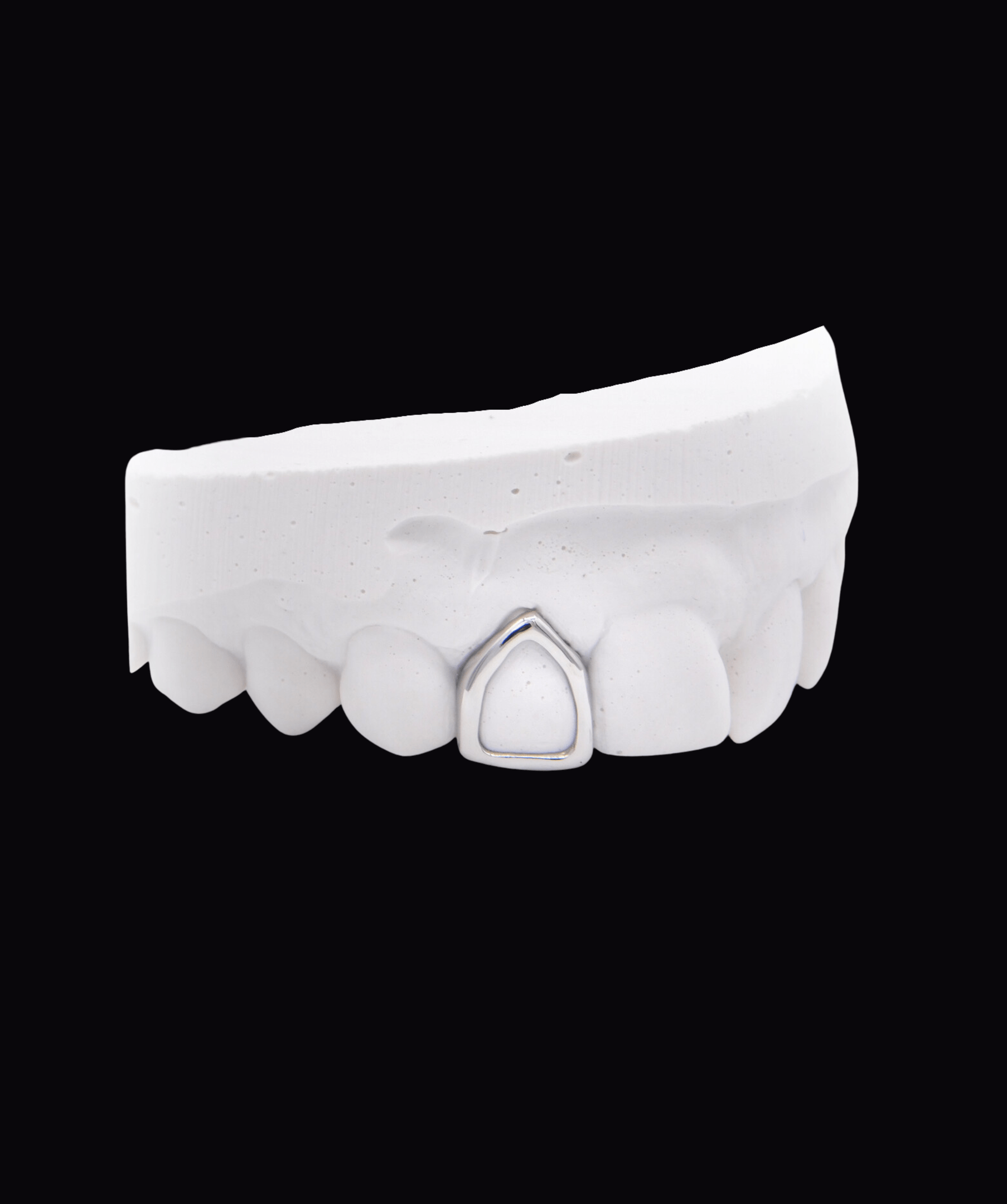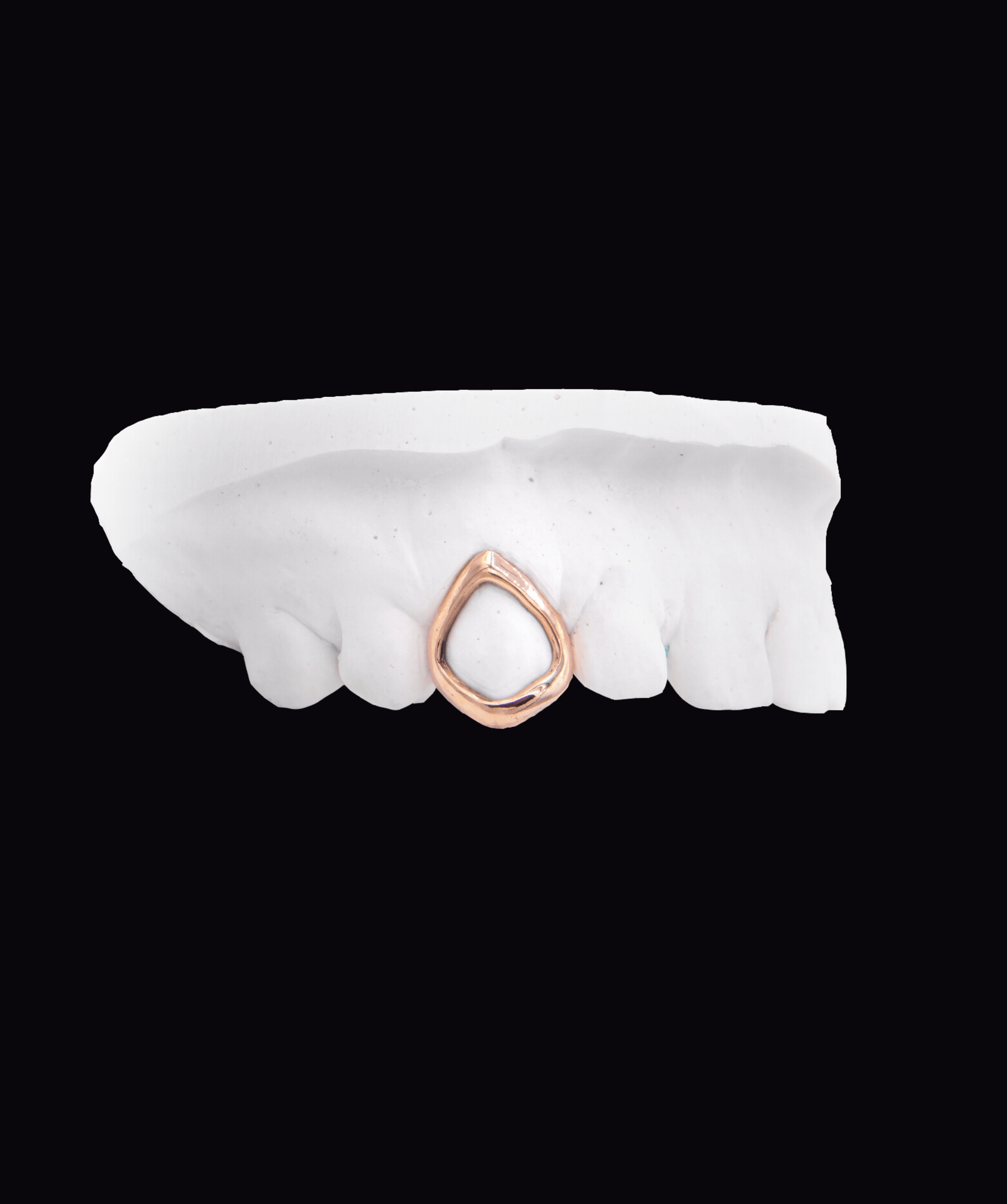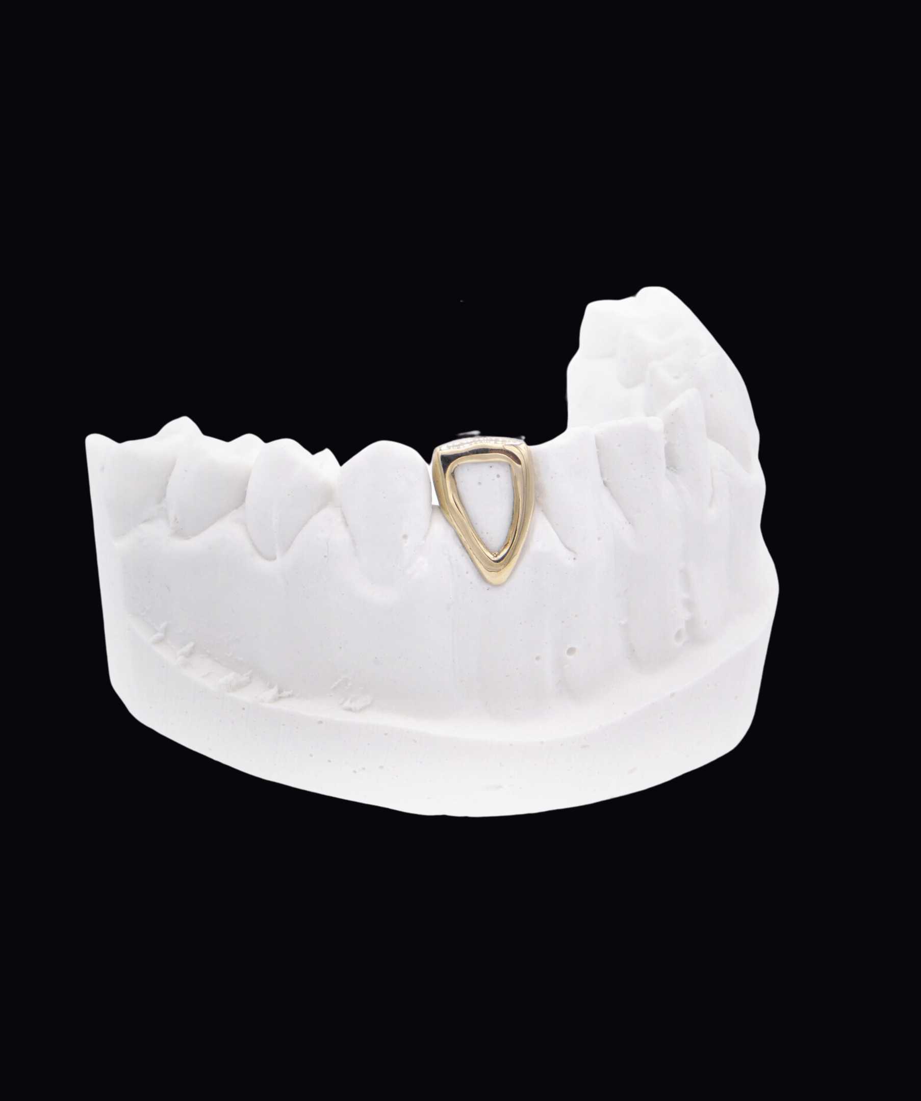 Custom gold window tooth made to perfectly fit over your tooth. The tooth is available in dental gold, solid 9k or 18k yellow, white or rose gold. They are made to clip-on to your own teeth, removable at any time. Mirror finish shine comes as standard.