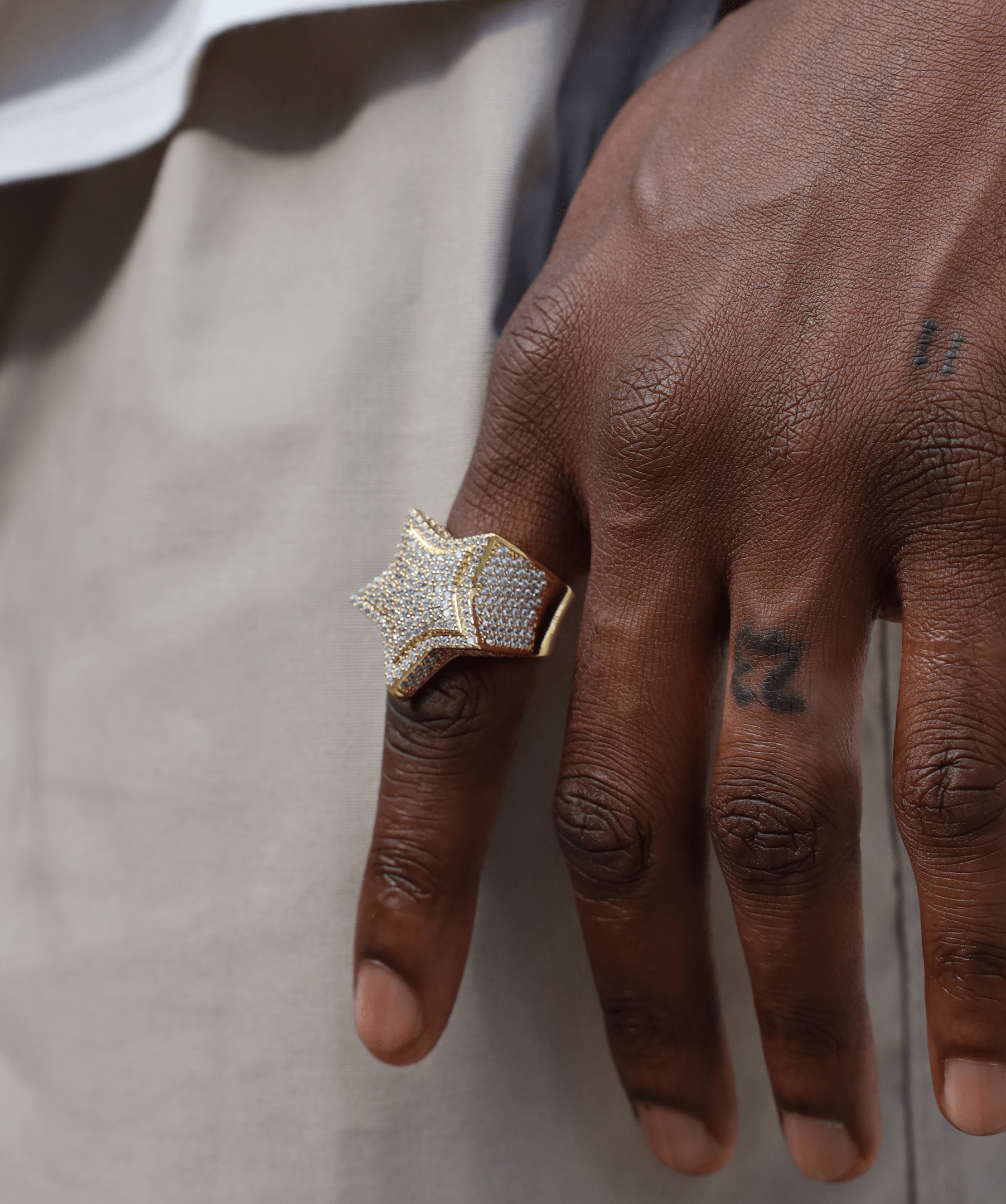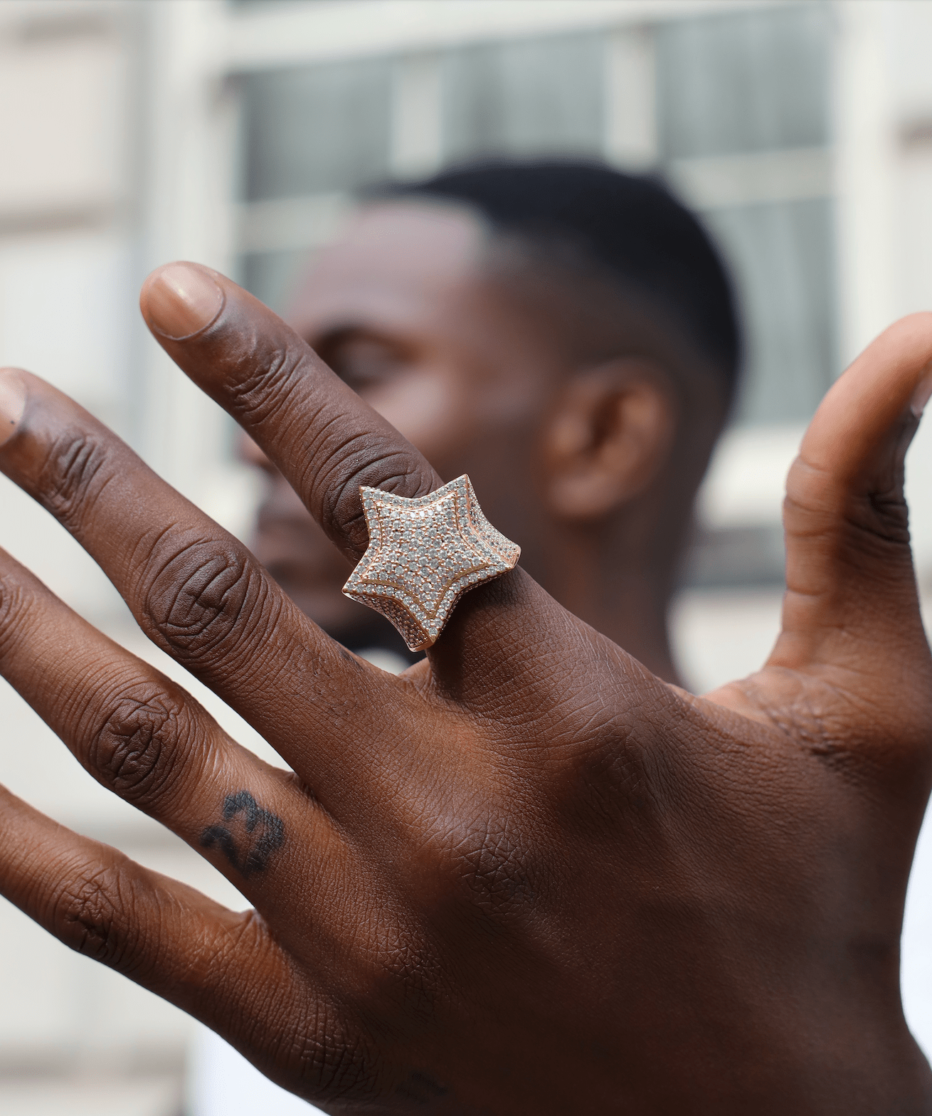 A bold symbol of power and elevation, the Layered Star Ring is designed to stand out. Its dimensional shape and fully iced surface create an eye-catching presence, ensuring every move shines with distinction.