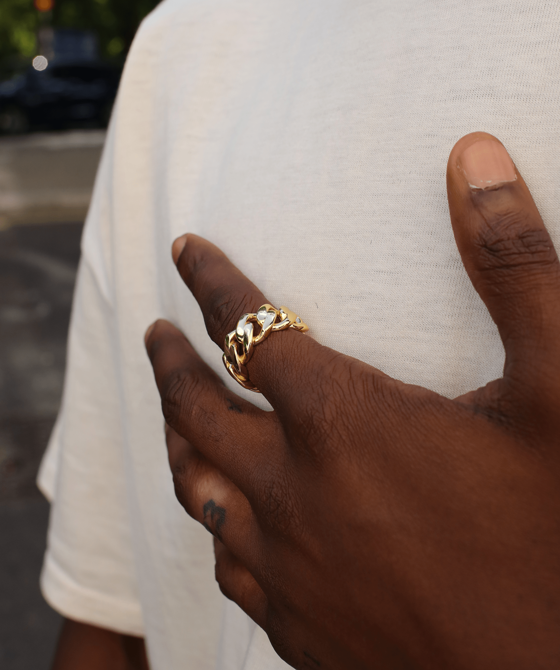 This Iced London Miami Cuban Link Ring was crafted in Europe from Italian 925 Silver coated 3x in the same 14k gold we use for our solid gold pieces. This is known as Vermeil. The thickness of gold on our products are 6x the normal amount of gold found in plating. This ring is manufactured in the highest quality with the same manufacturing processes and standards as the best solid gold jewellery on the market. This product will not fade or tarnish.