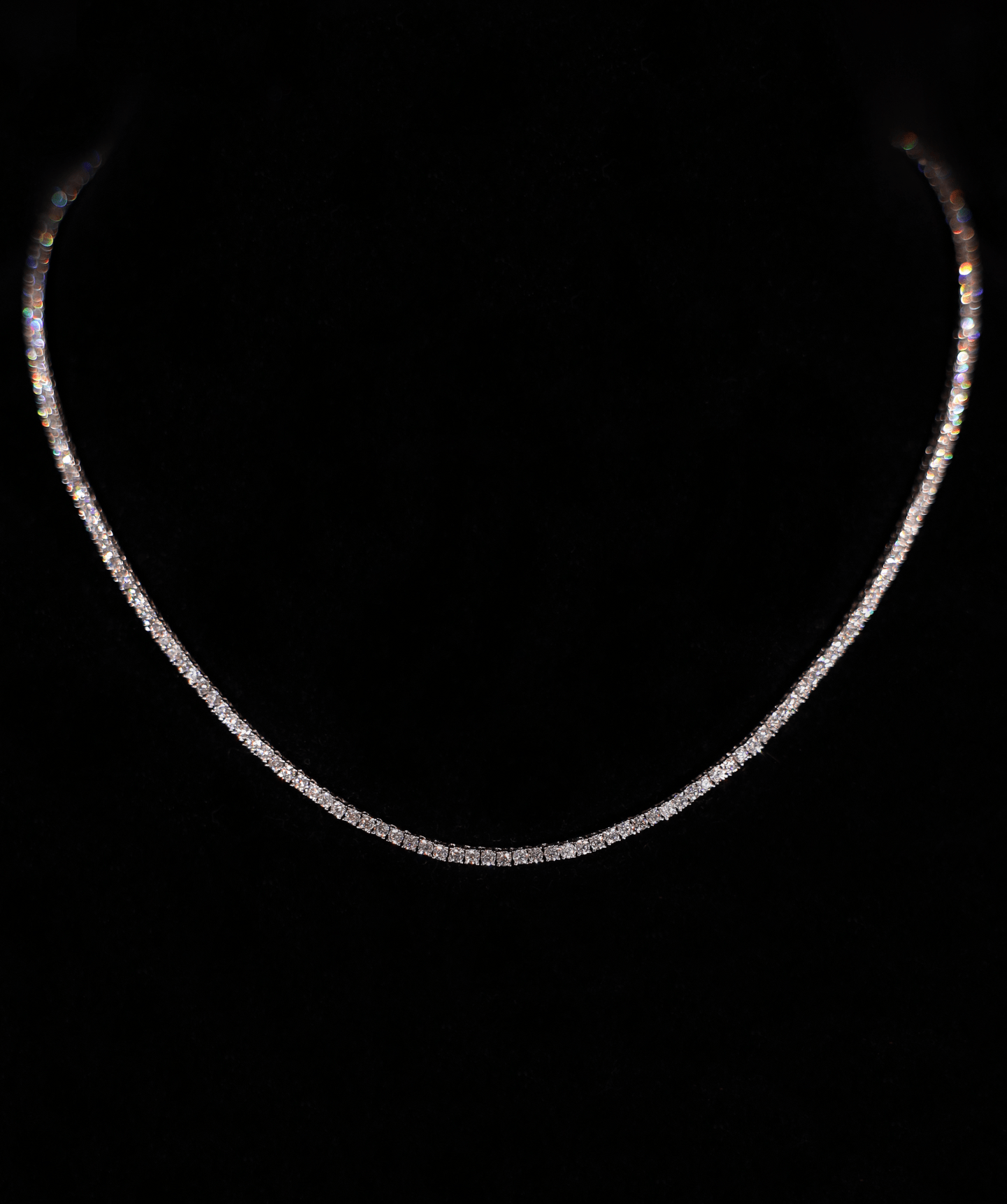 The micro tennis necklace refines the classic design with a subtle 2mm profile, ensuring a clean and understated look while maintaining high brilliance. Hand-set stones create a seamless flow of light, catching the eye without being overpowering. Lightweight and versatile, it transitions easily from everyday wear to elevated occasions.