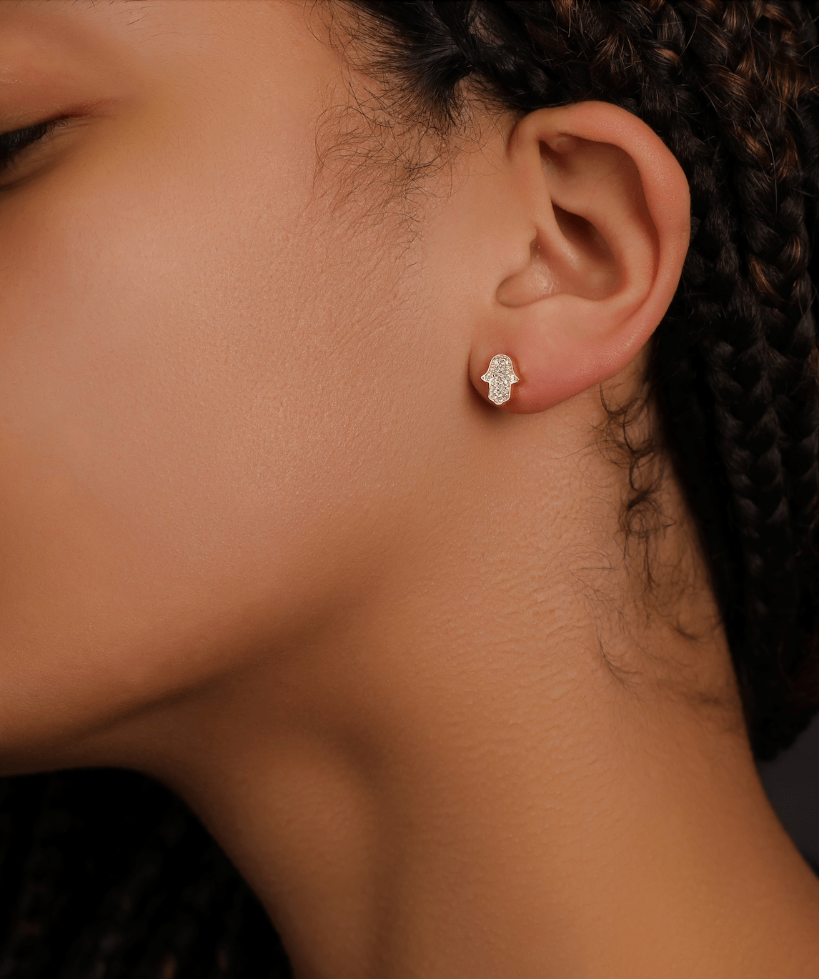 The Hamsa hand is recognised across cultures as a symbol of protection, good fortune, and strength. These mini stud earrings bring that meaning to life with pavé-set stones, set in 925 silver with a yellow gold finish. Designed for a refined yet understated look, their compact size makes them ideal for layering or wearing alone as a subtle statement.
