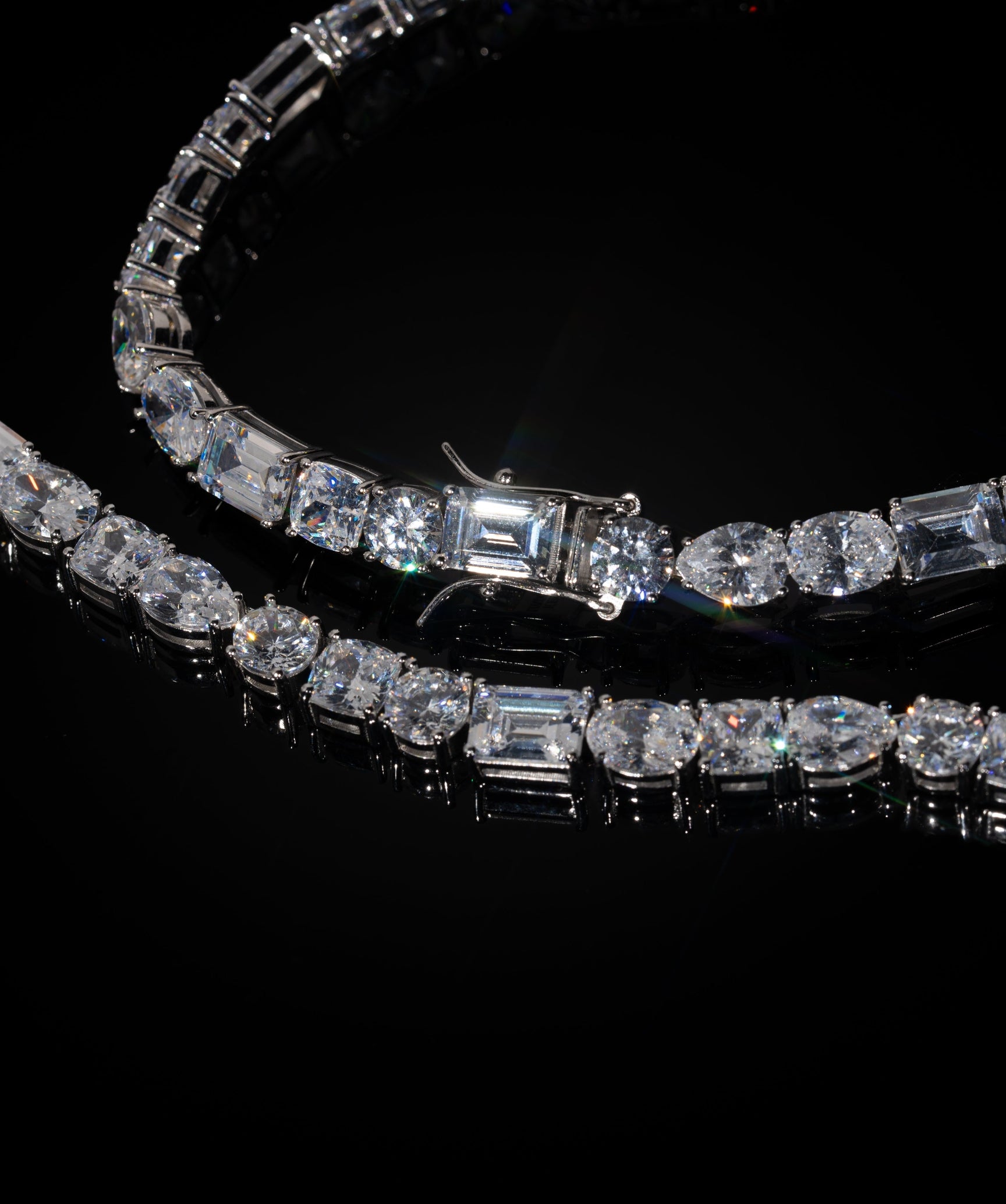 The Mixed Shape Tennis Necklace is a refined statement piece, balancing symmetry with contrast. Featuring a dynamic blend of round, oval, pear, emerald, cushion, and radiant-cut stones, each link is set to maximise light reflection and brilliance. A seamless open box clasp ensures a secure yet elegant fit.