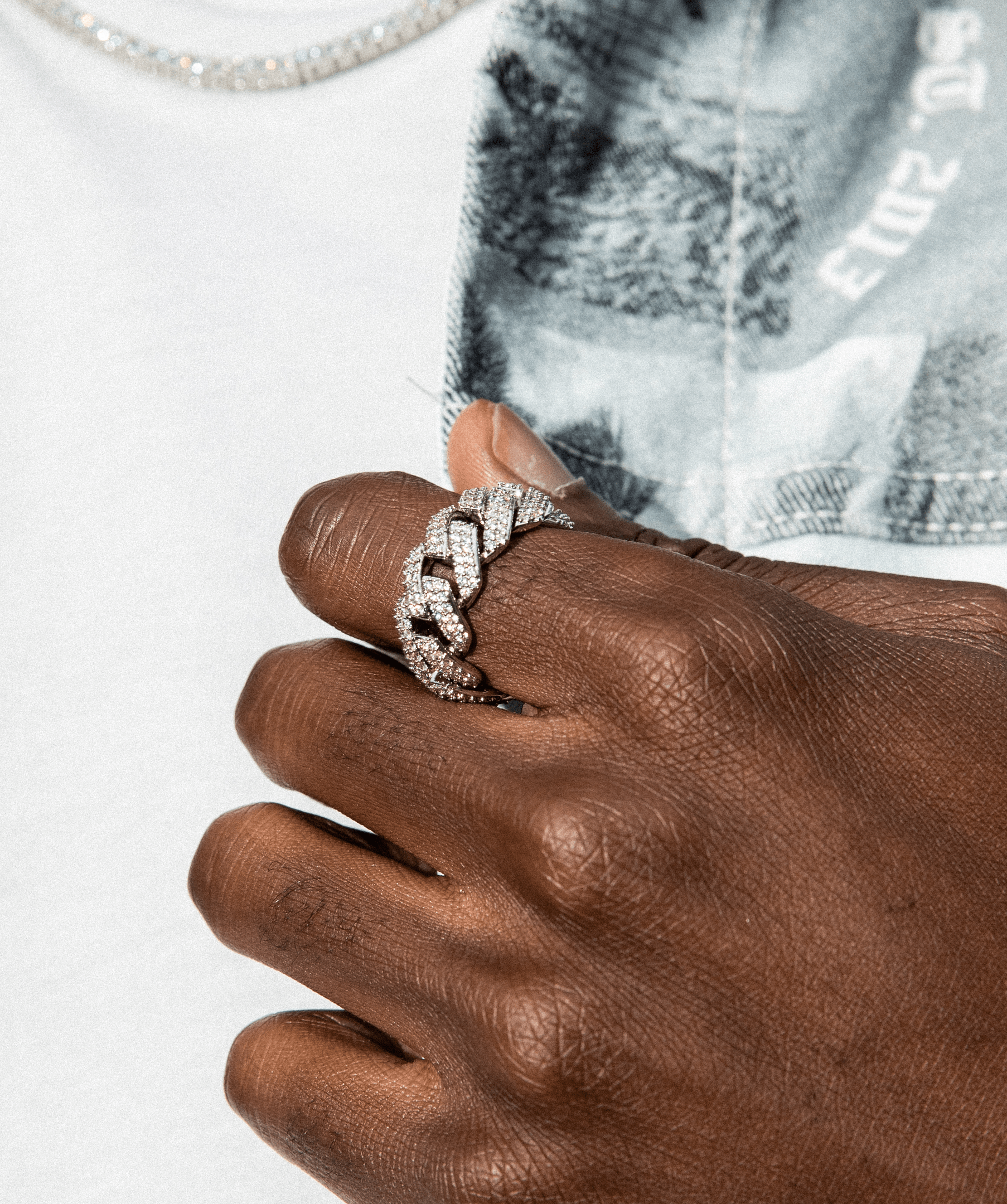Iced London's Prong Ring features hand-set stones which are secured by prongs. The prong-setting allows light to strike from more angles, increasing its brilliance.