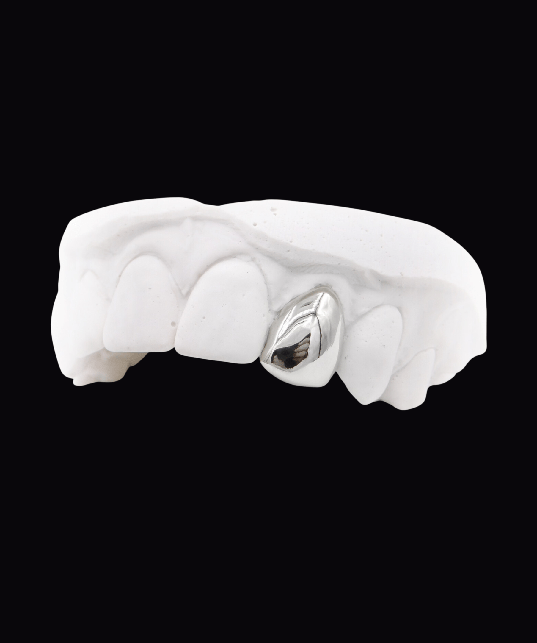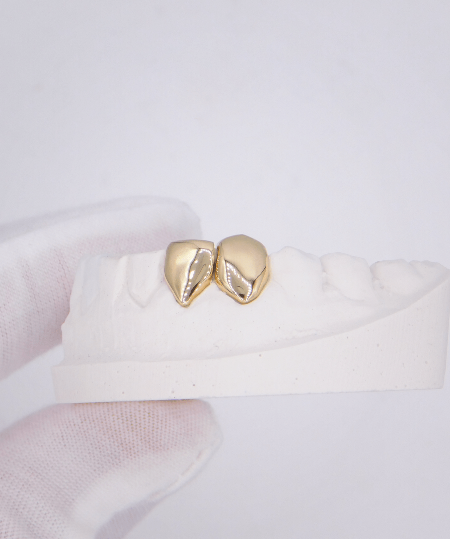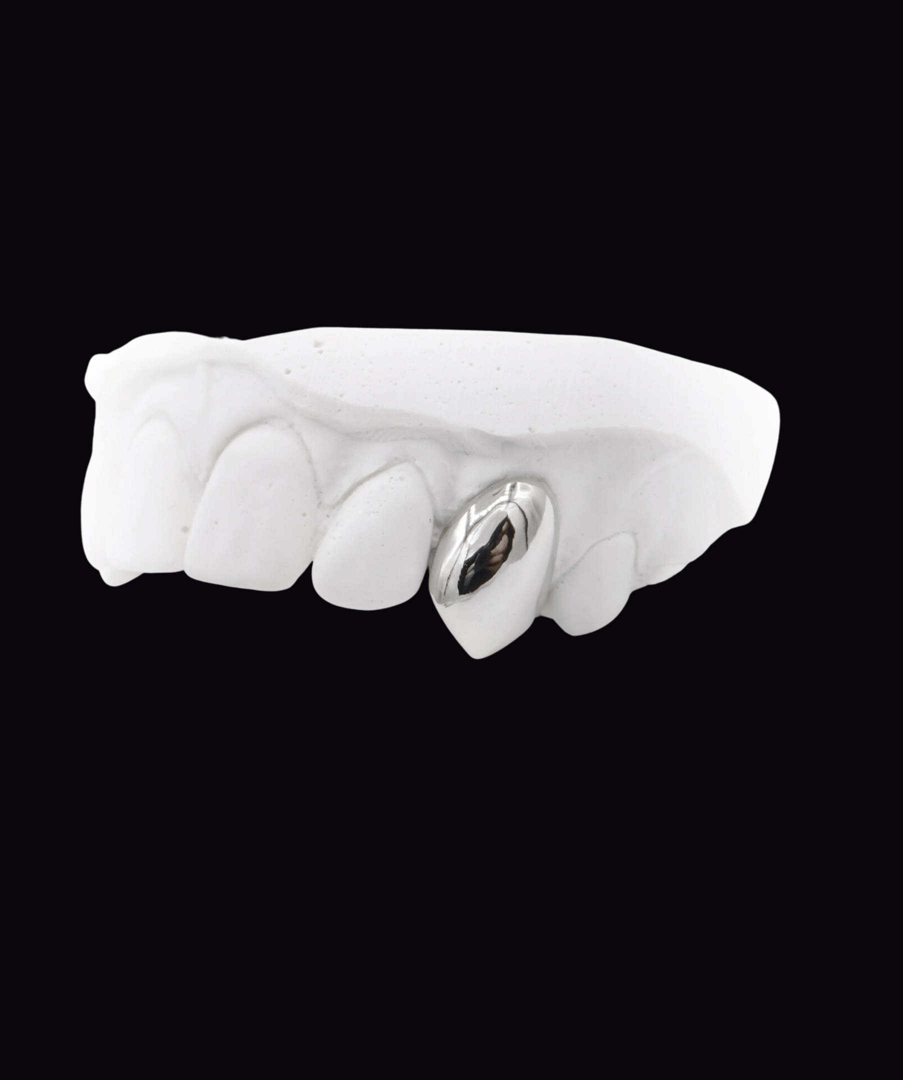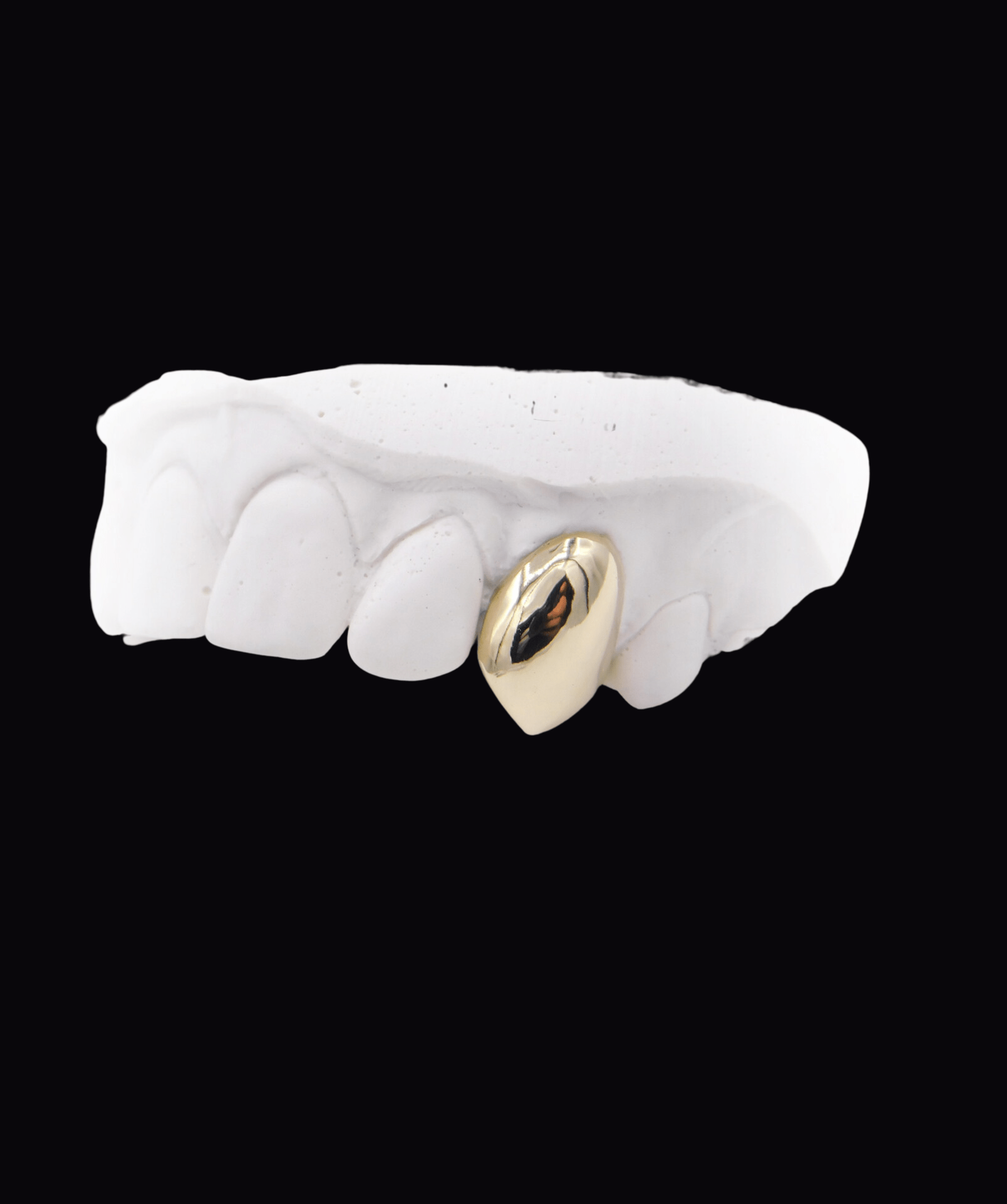 Custom made single gold tooth made for any of your 8 top front teeth or 8 lower front teeth. Available in dental gold, solid 9k or 18k yellow, white or rose gold. They are made to clip-on to your own teeth, removable at any time. Mirror finish shine comes as standard.
