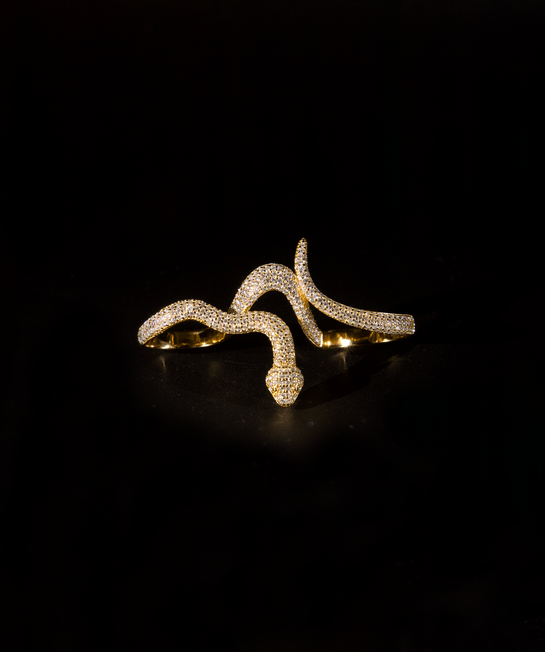 The Snake Ring coils with an effortless blend of fluidity and precision, embodying mystique and unrelenting power. Encrusted in a seamless pavé of VS1 diamonds, this sculptural masterpiece captures the hypnotic allure of the serpent, a symbol of transformation, wisdom, and dominance. Designed to contour elegantly around the finger, it is both a statement and a talisman.