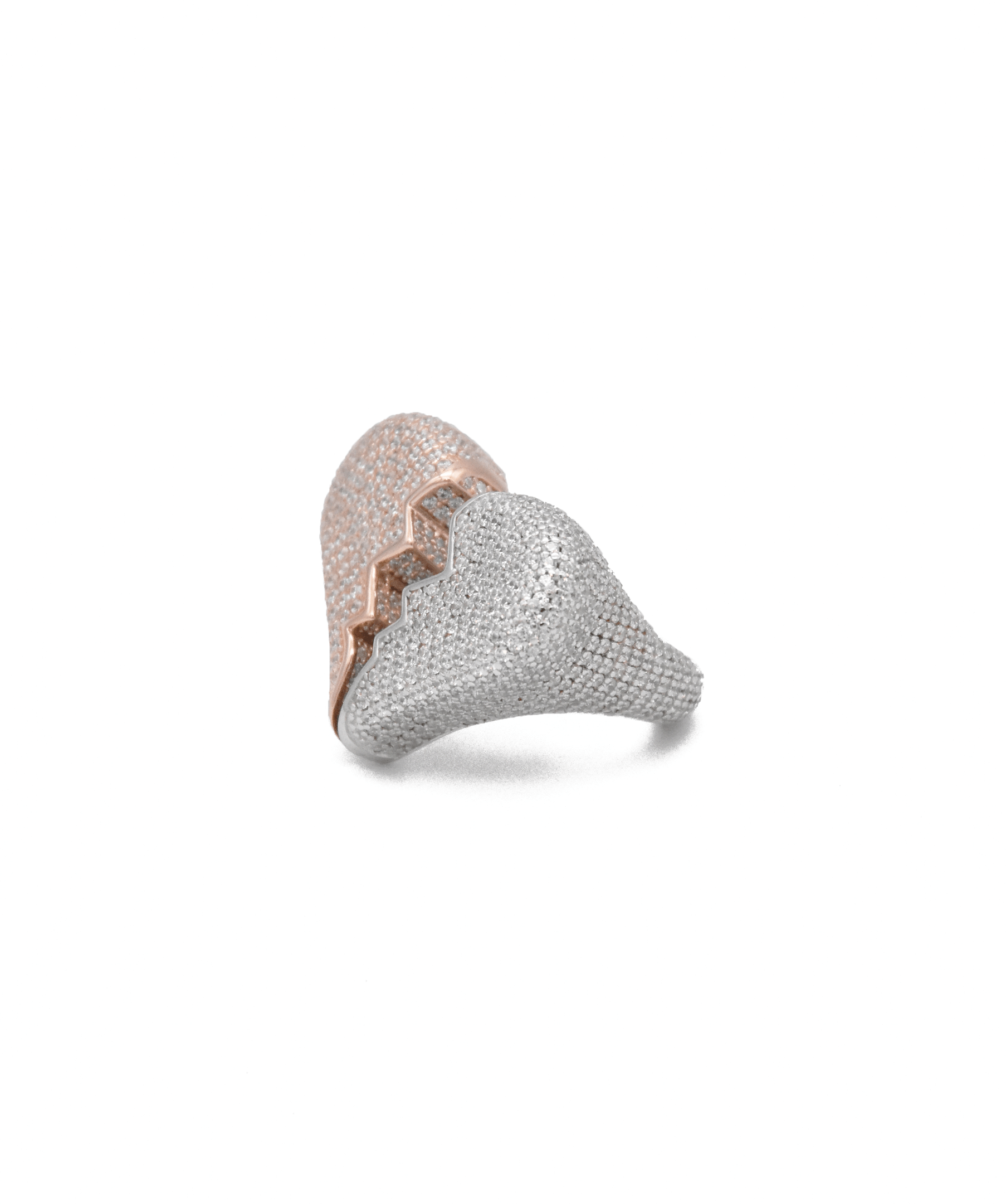 Iced London's Two-Tone Diamond Broken Heart Ring is flooded with over 600 stones, each individually hand-set. It is iced out on all angles, including the inside of the broken heart, which goes to show the level of time, detail and craftsmanship invested into making this piece. The ring is made up of 100% precious metals made from 925 sterling silver and 5A CZ.