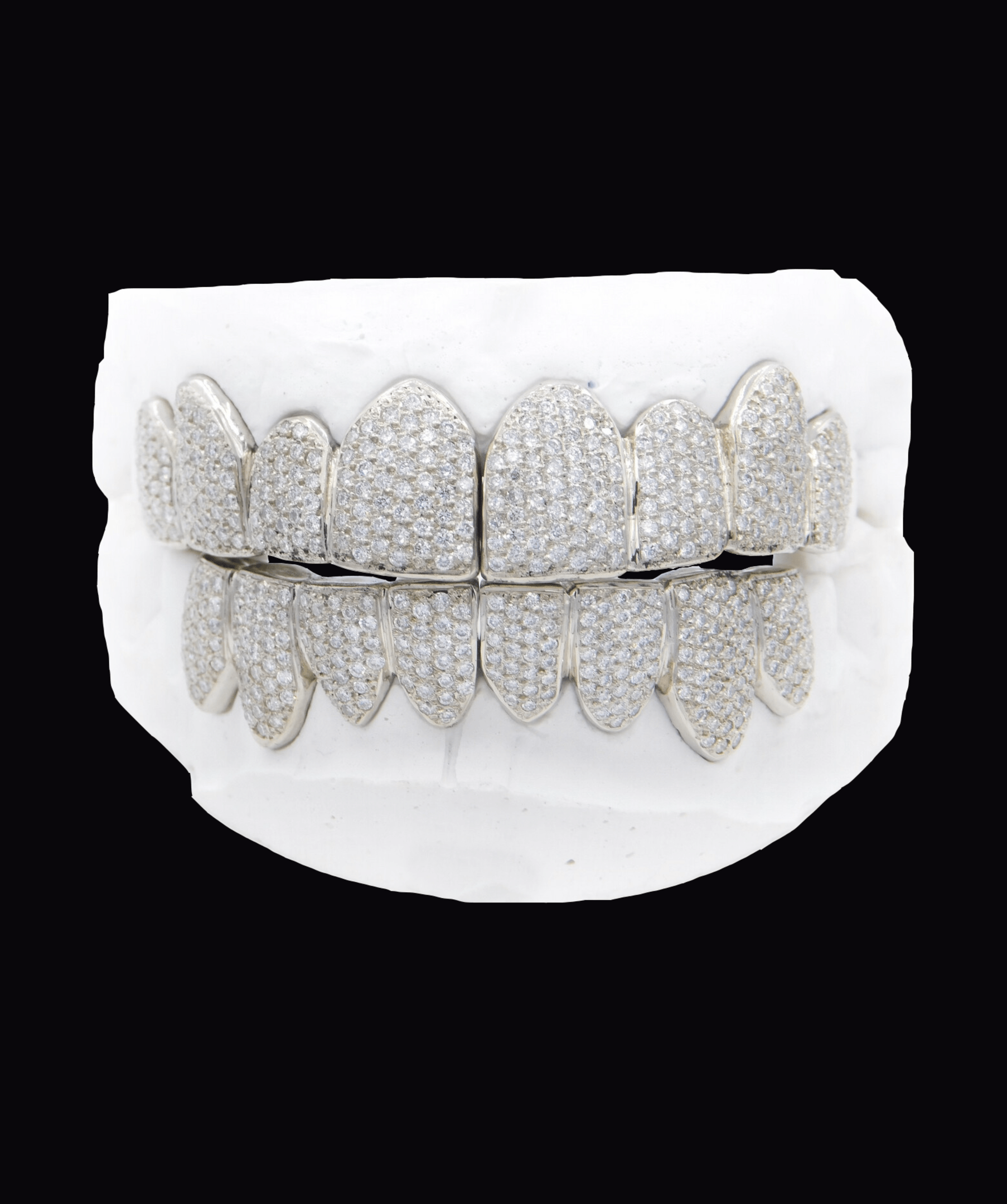 Upper & Lower Set of Iced Grillz starting as a row of 6, available up to a row of 10. Available in dental gold, solid 9k or 18k yellow, white or rose gold. Iced out with real VVS diamonds or Moissanite. They are made to clip-on to your own teeth, removable at any time. Custom-made to fit your teeth with mirror finish as standard. Can cover missing teeth.