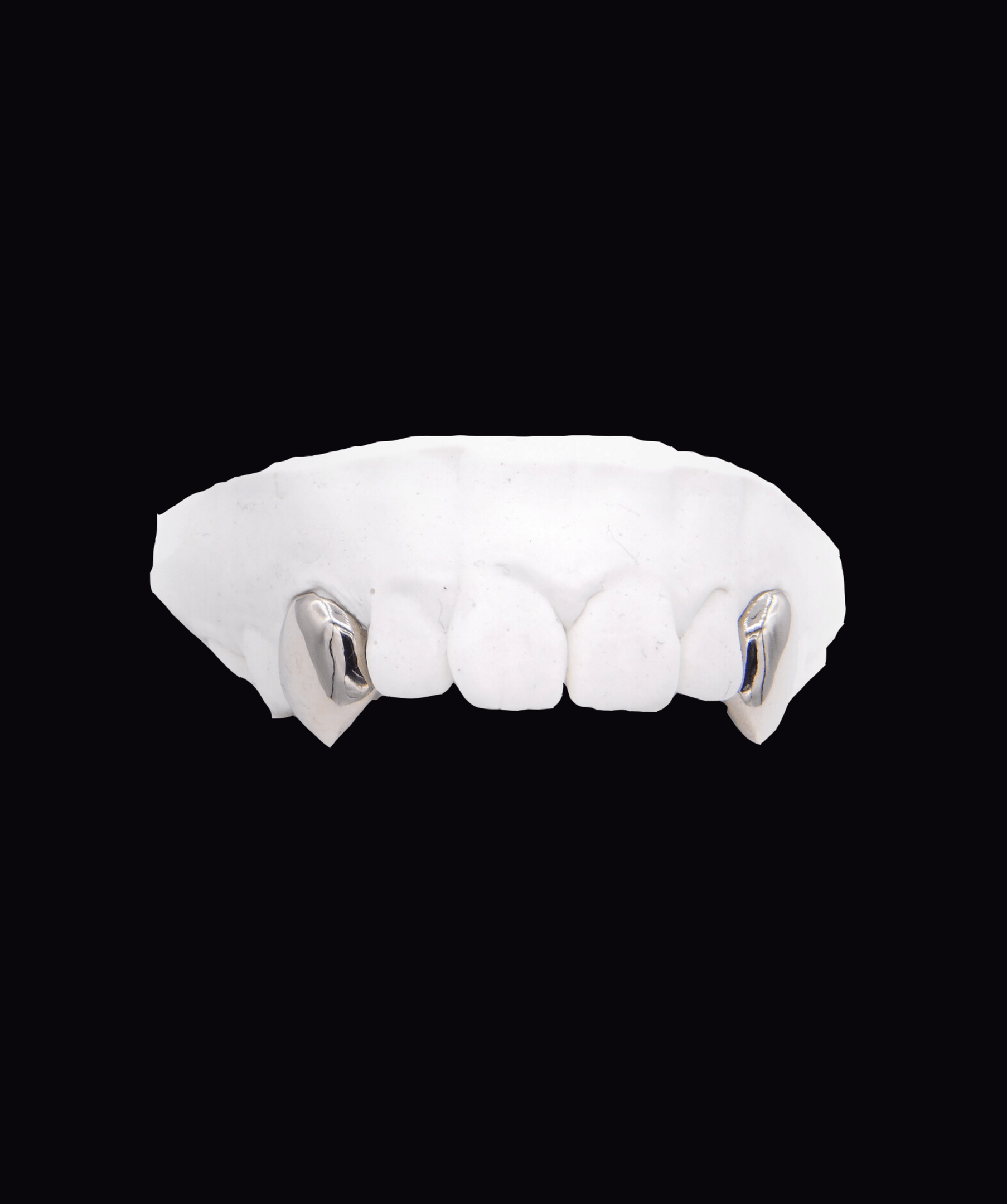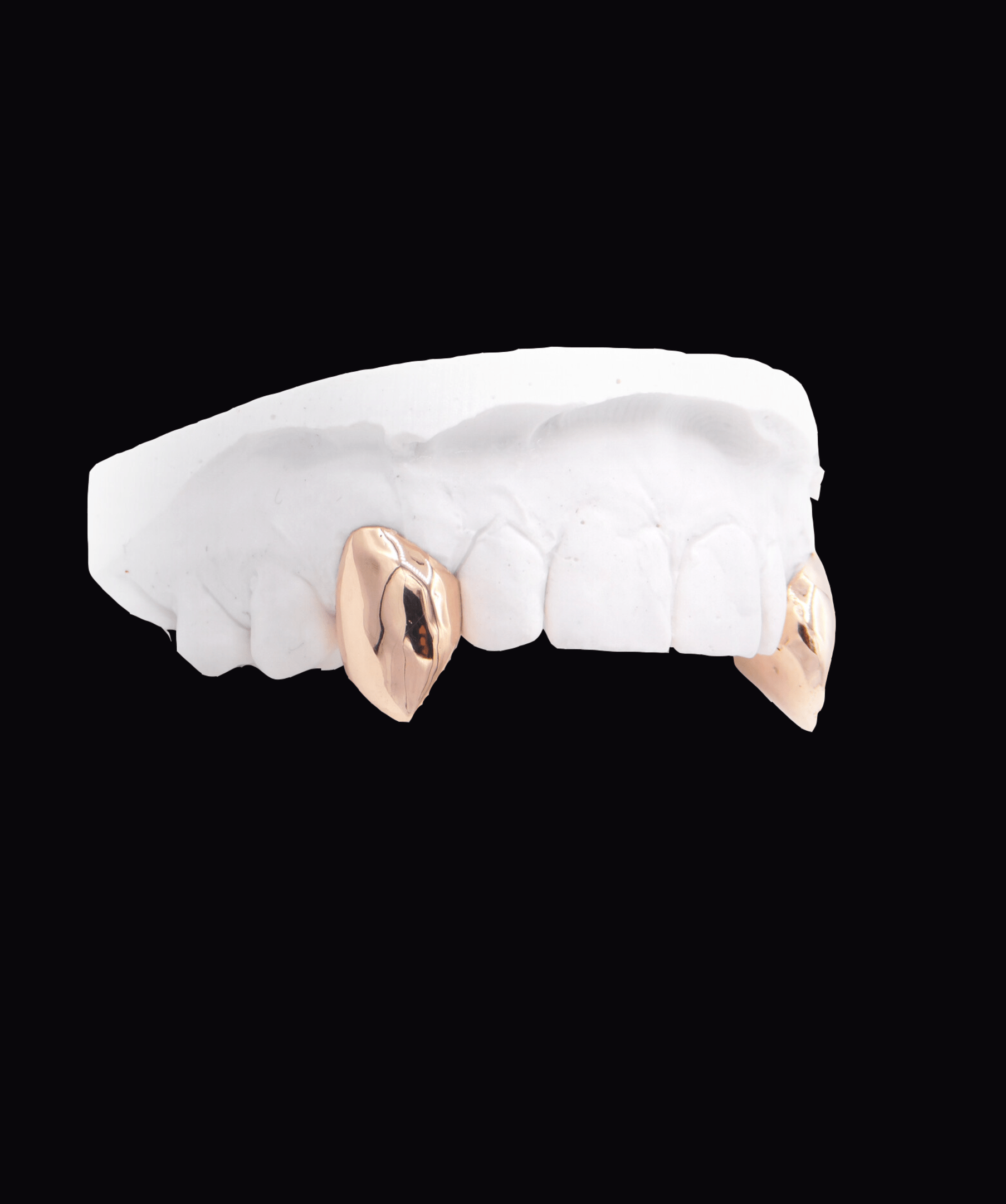 Custom set of 2 pointy Vampire Fangs. Can be made for Upper or Lower canines. Available in dental gold, solid 9k or 18k yellow, white or rose gold. They are made to clip-on to your own teeth, removable at any time. Mirror finish shine comes as standard.